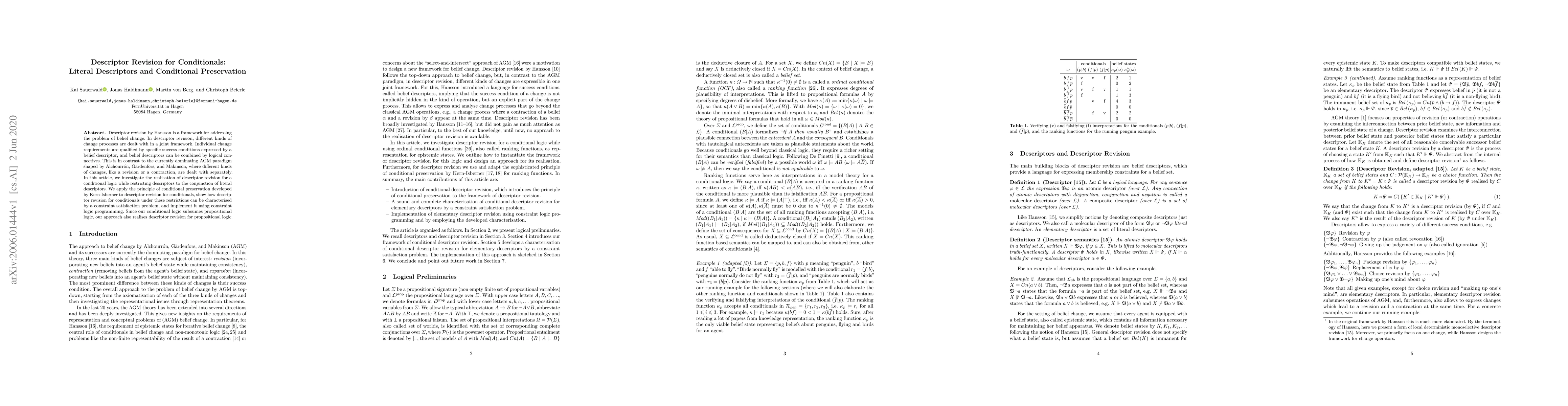 This paper explores descriptor revision for conditional logic, contrasting it with the AGM paradigm, and proposes a method for revising belief descriptors using conditional preservation. It characterizes descriptor revision under literal constraints as a constraint satisfaction problem and implements it via constraint logic programming.