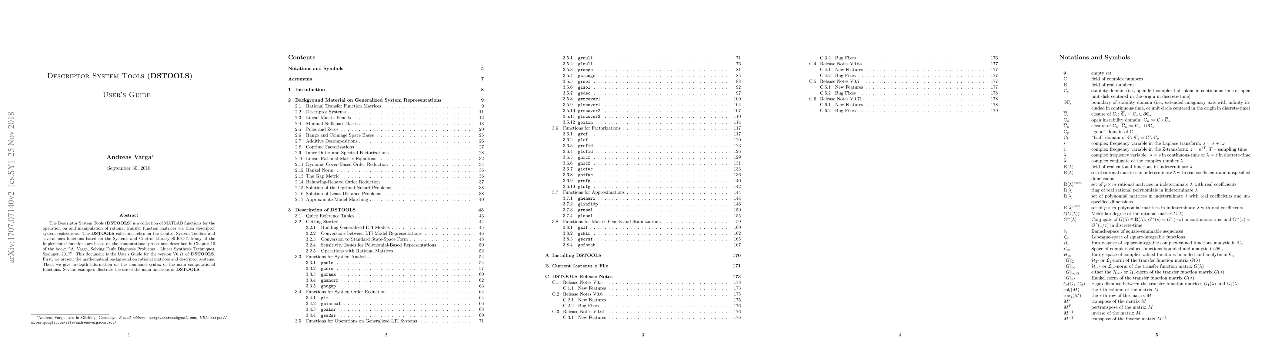 The Descriptor System Tools (DSTOOLS) User's Guide provides MATLAB functions for manipulating rational transfer function matrices using descriptor system realizations, relying on the Control System Toolbox and SLICOT. The guide details the mathematical background and command syntax for the main computational functions, supplemented by illustrative examples.