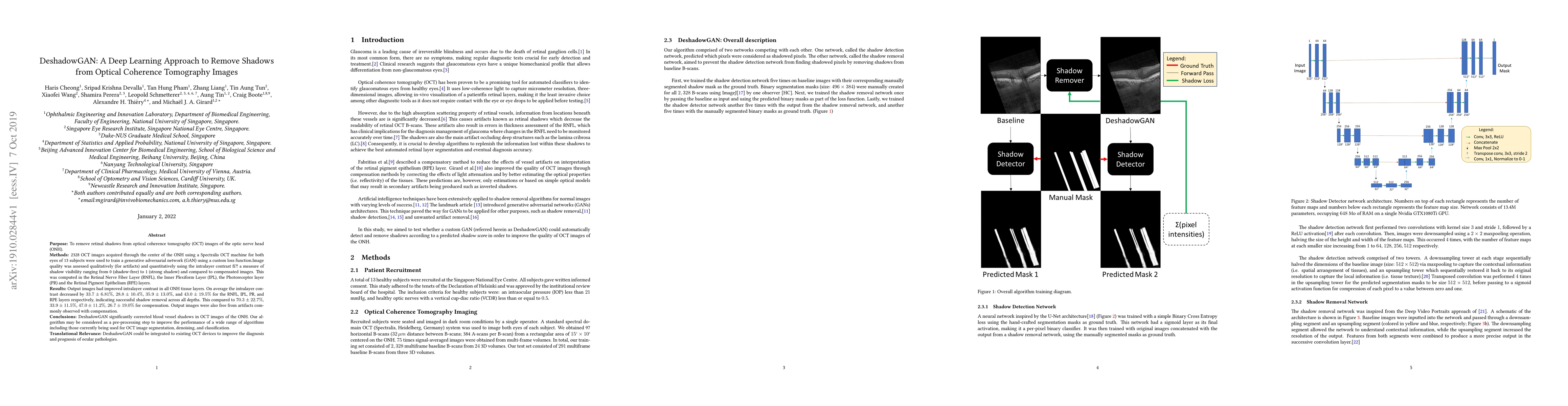 DeshadowGAN employs a deep learning GAN to effectively remove shadows from OCT images of the optic nerve head, significantly improving intralayer contrast and eliminating artifacts. This method holds promise for enhancing the diagnostic accuracy of various OCT-based algorithms.