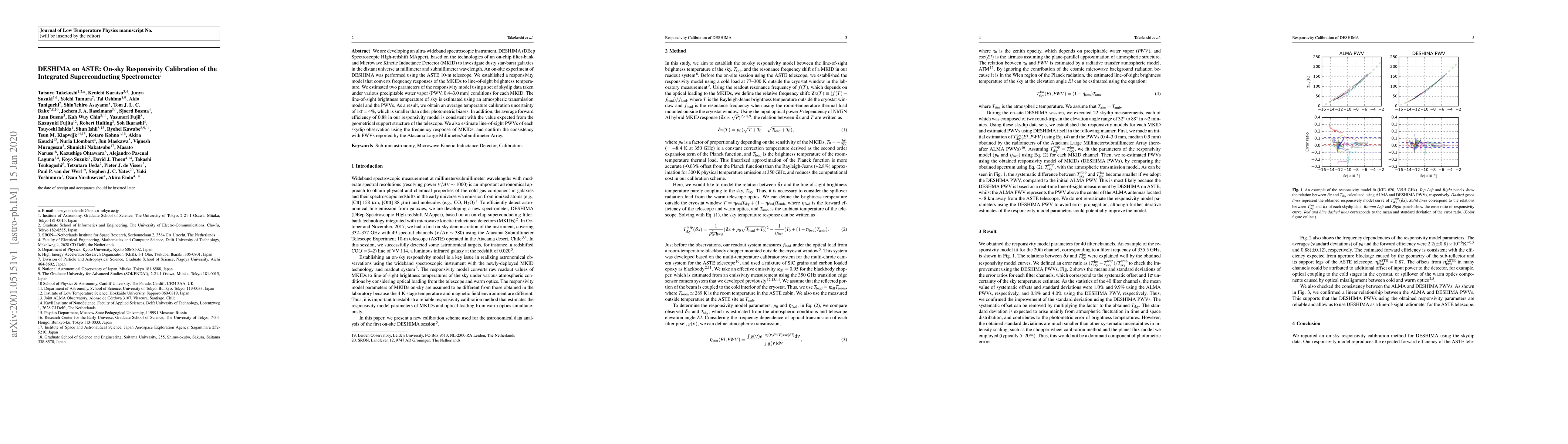 We are developing an ultra-wideband spectroscopic instrument, DESHIMA (DEep Spectroscopic HIgh-redshift MApper), based on the technologies of an on-chip filter-bank and Microwave Kinetic Inductance Detector (MKID) to investigate dusty star-burst galaxies in the distant universe at millimeter and submillimeter wavelength. An on-site experiment of DESHIMA was performed using the ASTE 10-m telescope. We established a responsivity model that converts frequency responses of the MKIDs to line-of-sight brightness temperature. We estimated two parameters of the responsivity model using a set of skydip data taken under various precipitable water vapor (PWV, 0.4-3.0 mm) conditions for each MKID. The line-of-sight brightness temperature of sky is estimated using an atmospheric transmission model and the PWVs. As a result, we obtain an average temperature calibration uncertainty of $1\sigma=4$%, which is smaller than other photometric biases. In addition, the average forward efficiency of 0.88 in our responsivity model is consistent with the value expected from the geometrical support structure of the telescope. We also estimate line-of-sight PWVs of each skydip observation using the frequency response of MKIDs, and confirm the consistency with PWVs reported by the Atacama Large Millimeter/submillimeter Array.