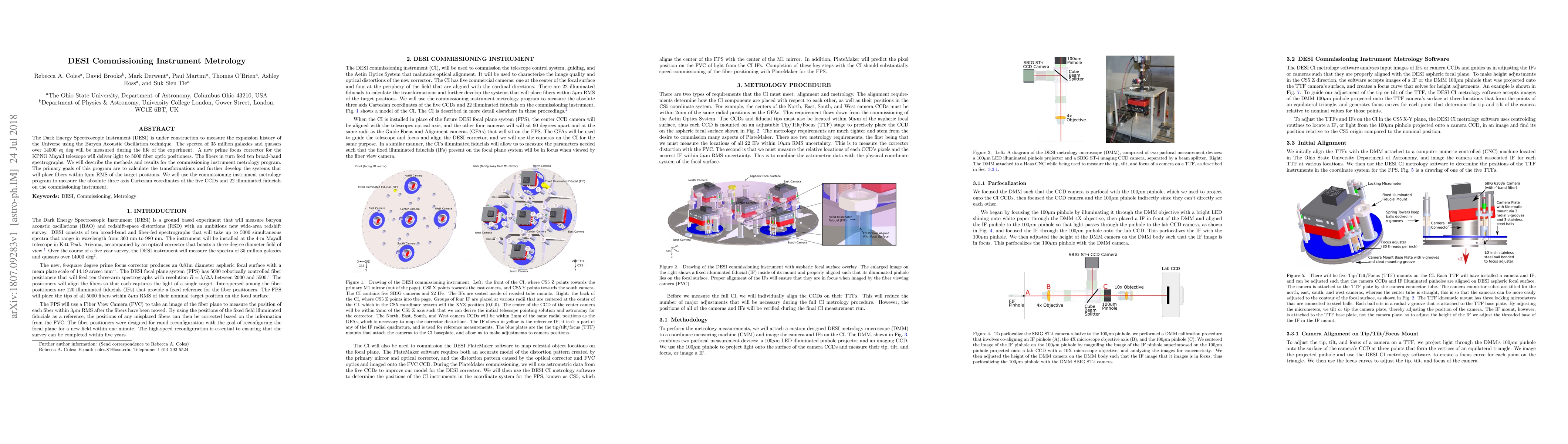 The Dark Energy Spectroscopic Instrument (DESI) is under construction to measure the expansion history of the Universe using the Baryon Acoustic Oscillation technique. The spectra of 35 million galaxies and quasars over 14000 sq deg will be measured during the life of the experiment. A new prime focus corrector for the KPNO Mayall telescope will deliver light to 5000 fiber optic positioners. The fibers in turn feed ten broad-band spectrographs. We will describe the methods and results for the commissioning instrument metrology program. The primary goals of this program are to calculate the transformations and further develop the systems that will place fibers within 5um RMS of the target positions. We will use the commissioning instrument metrology program to measure the absolute three axis Cartesian coordinates of the five CCDs and 22 illuminated fiducials on the commissioning instrument.