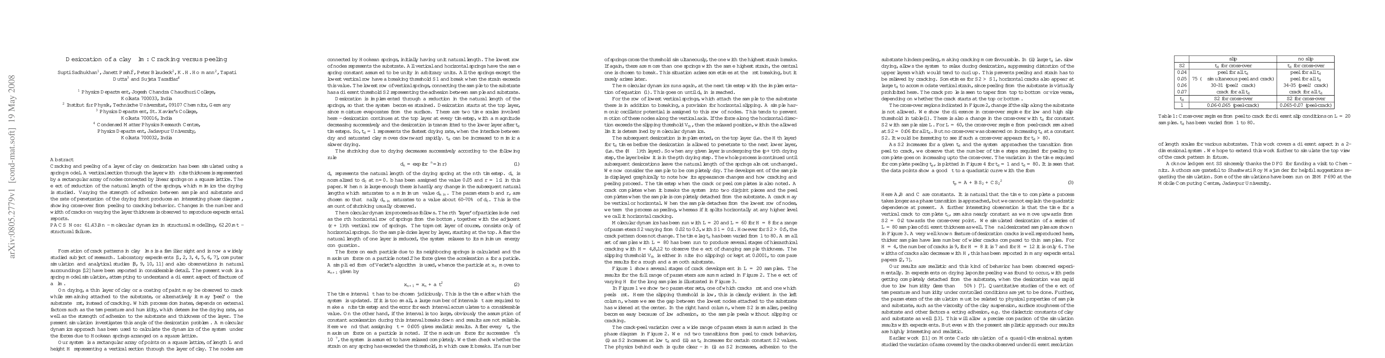 This paper simulates the desiccation of a clay film using a spring model to study cracking versus peeling behavior. The simulation reveals a phase diagram showing a transition from peeling to cracking based on adhesion strength and drying rate, and it reproduces experimental observations of crack patterns with varying layer thickness.