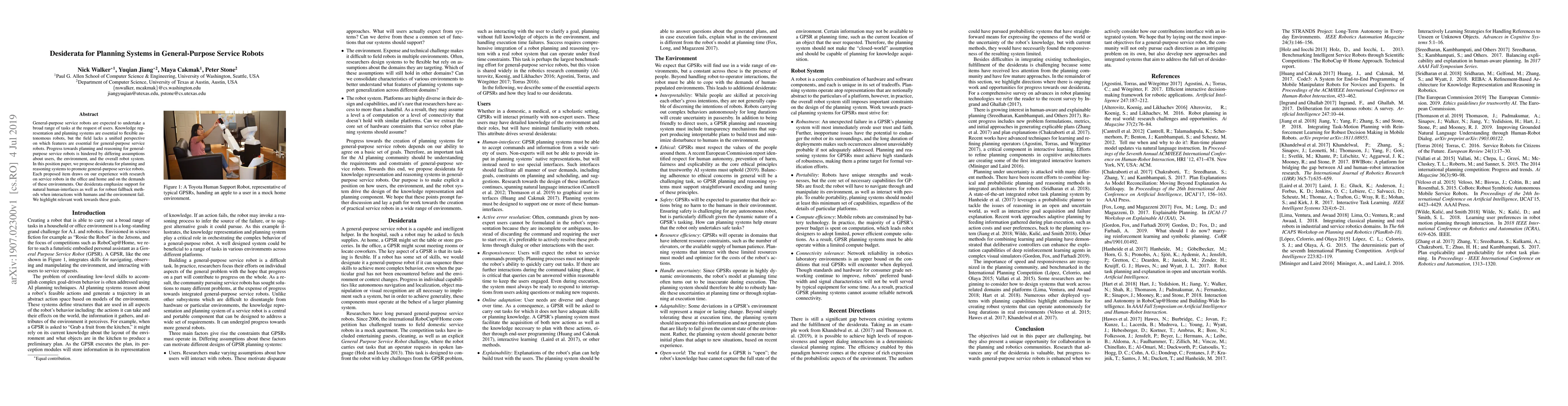 Understanding requirements and constraints of general-purpose service robots is crucial for progress in AI planning, enabling the creation of practical service robots in a wide range of environments.