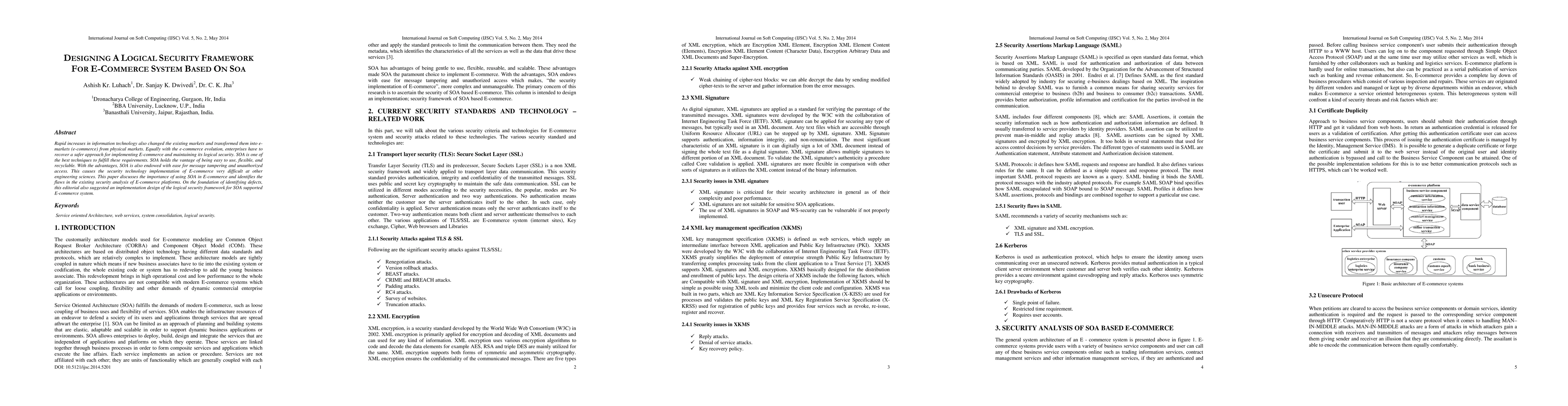 Rapid increases in information technology also changed the existing markets and transformed them into e- markets (e-commerce) from physical markets. Equally with the e-commerce evolution, enterprises have to recover a safer approach for implementing E-commerce and maintaining its logical security. SOA is one of the best techniques to fulfill these requirements. SOA holds the vantage of being easy to use, flexible, and recyclable. With the advantages, SOA is also endowed with ease for message tampering and unauthorized access. This causes the security technology implementation of E-commerce very difficult at other engineering sciences. This paper discusses the importance of using SOA in E-commerce and identifies the flaws in the existing security analysis of E-commerce platforms. On the foundation of identifying defects, this editorial also suggested an implementation design of the logical security framework for SOA supported E-commerce system.