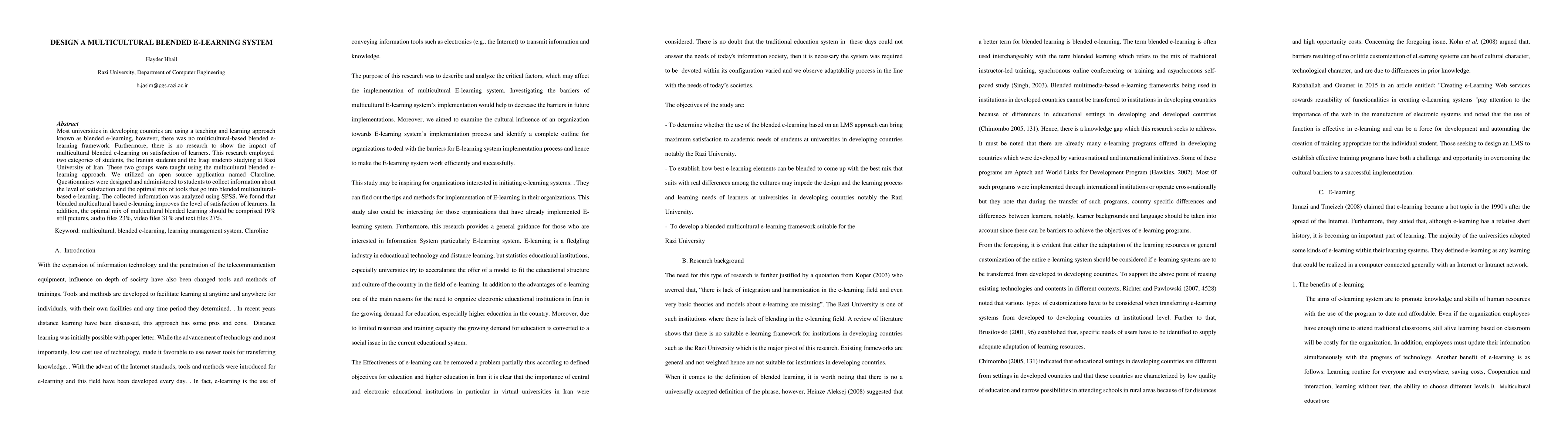 This study developed a multicultural blended e-learning system using Claroline and assessed its impact on satisfaction among Iranian and Iraqi students at Razi University. The results showed that this approach enhances learner satisfaction, with an optimal mix of 19% still pictures, 23% audio files, 31% video files, and 27% text files.