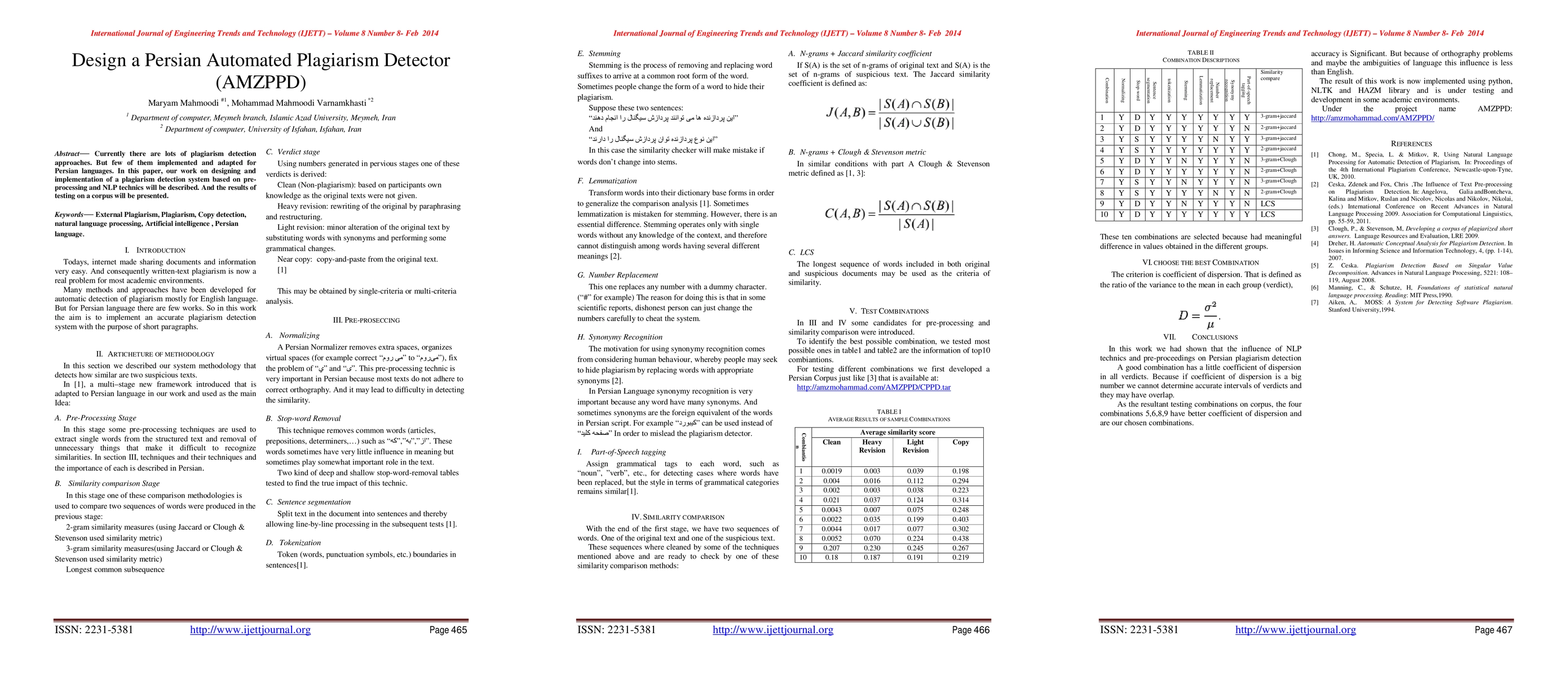 Currently there are lots of plagiarism detection approaches. But few of them implemented and adapted for Persian languages. In this paper, our work on designing and implementation of a plagiarism detection system based on pre-processing and NLP technics will be described. And the results of testing on a corpus will be presented.