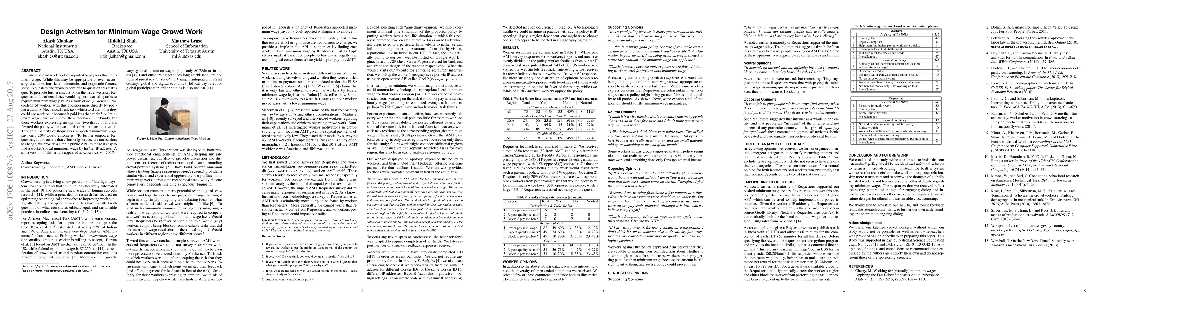 A survey of crowd workers and Requesters found that 2/3 Indians favored requiring minimum wage pay for tasks, while 2/3 Americans opposed it, highlighting differing opinions on the issue. A public API is also provided to help Requesters find local minimum wages.