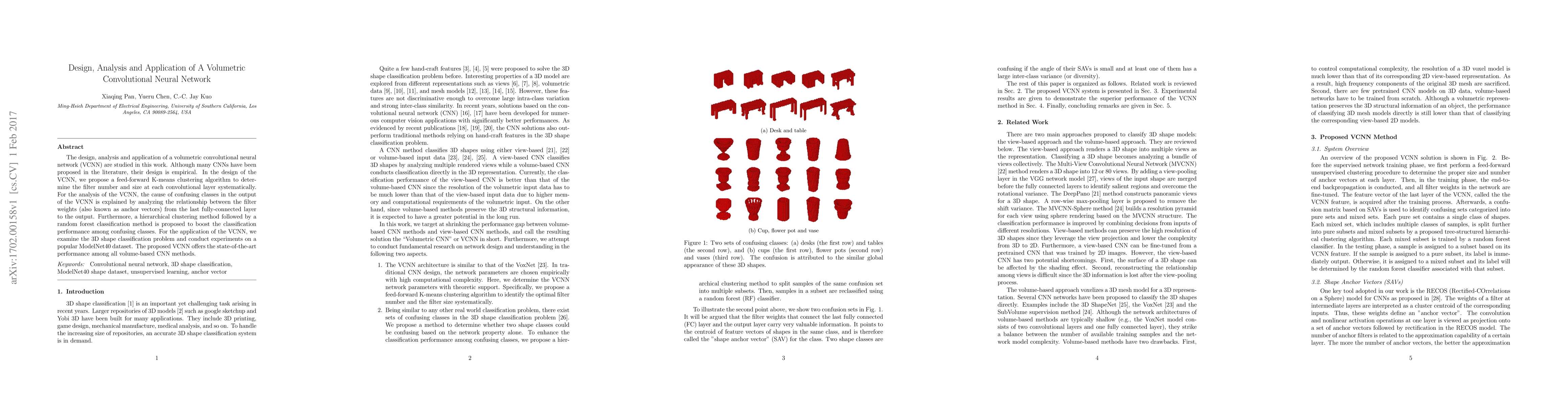 The design, analysis and application of a volumetric convolutional neural network (VCNN) are studied in this work. Although many CNNs have been proposed in the literature, their design is empirical. In the design of the VCNN, we propose a feed-forward K-means clustering algorithm to determine the filter number and size at each convolutional layer systematically. For the analysis of the VCNN, the cause of confusing classes in the output of the VCNN is explained by analyzing the relationship between the filter weights (also known as anchor vectors) from the last fully-connected layer to the output. Furthermore, a hierarchical clustering method followed by a random forest classification method is proposed to boost the classification performance among confusing classes. For the application of the VCNN, we examine the 3D shape classification problem and conduct experiments on a popular ModelNet40 dataset. The proposed VCNN offers the state-of-the-art performance among all volume-based CNN methods.