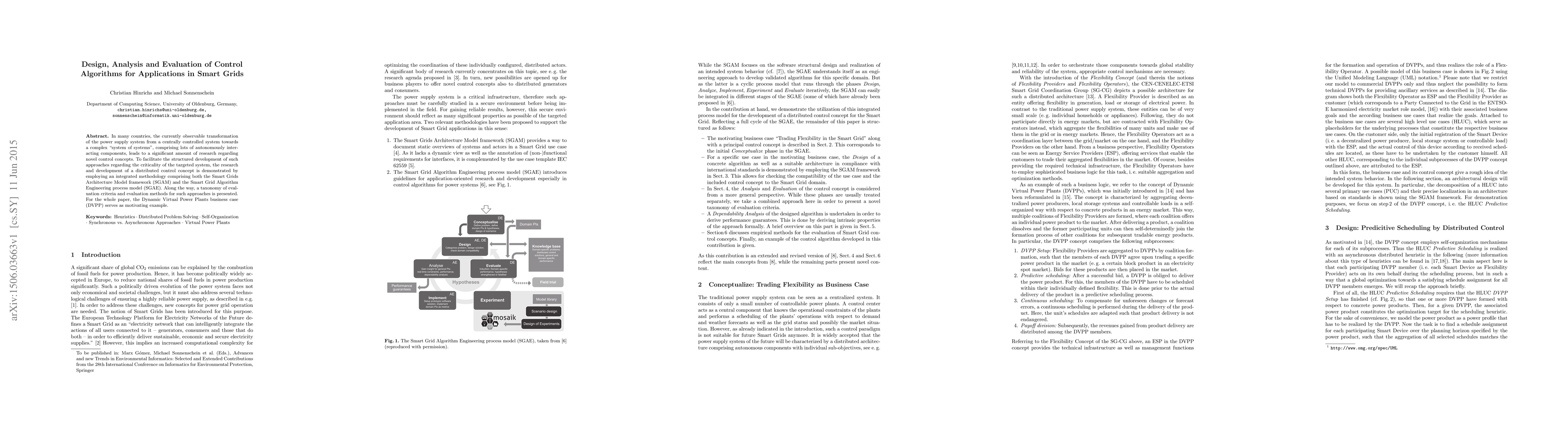 This paper develops a distributed control concept for smart grids, employing the Smart Grids Architecture Model and the Smart Grid Algorithm Engineering process model. It presents a taxonomy of evaluation criteria and methods, using the Dynamic Virtual Power Plants business case as a motivating example.