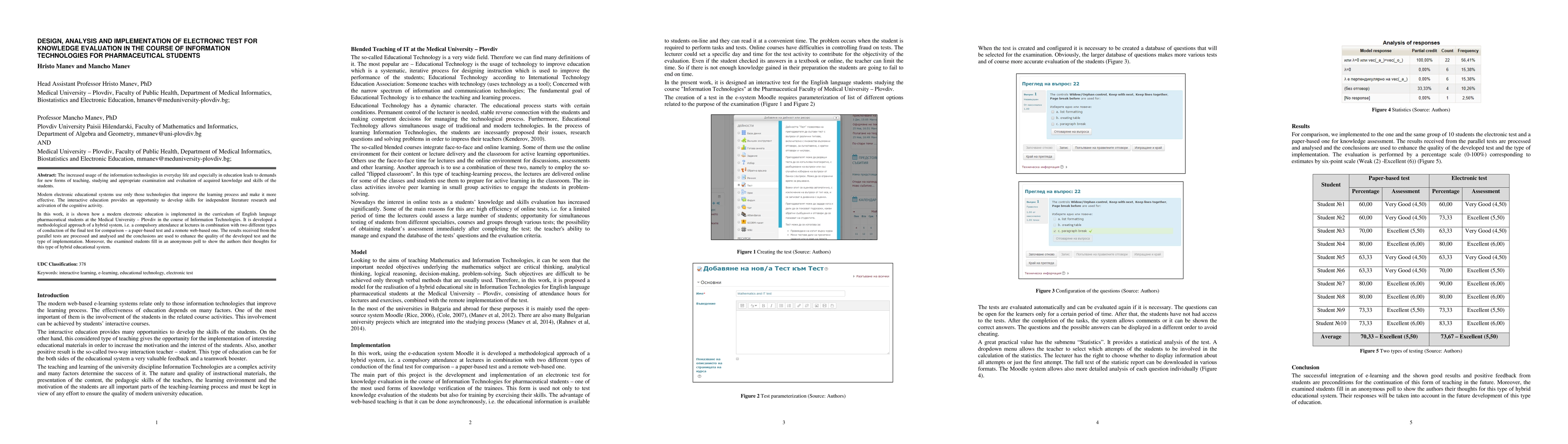 The increased usage of the information technologies in everyday life and especially in education leads to demands for new forms of teaching, studying and appropriate examination and evaluation of acquired knowledge and skills of the students. Modern electronic educational systems use only those technologies that improve the learning process and make it more effective. The interactive education provides an opportunity to develop skills for independent literature research and activation of the cognitive activity. In this work, it is shown how a modern electronic education is implemented in the curriculum of English language pharmaceutical students at the Medical University - Plovdiv in the course of Information Technologies. It is developed a methodological approach of a hybrid system, i.e. a compulsory attendance at lectures in combination with two different types of conduction of the final test for comparison - a paper-based test and a remote web-based one. The results received from the parallel tests are processed and analysed and the conclusions are used to enhance the quality of the developed test and the type of implementation. Moreover, the examined students fill in an anonymous poll to show the authors their thoughts for this type of hybrid educational system.