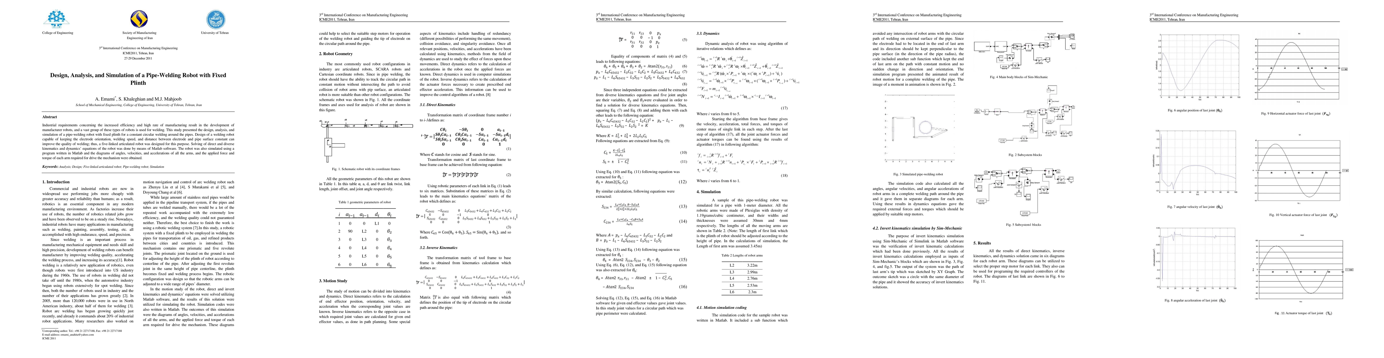 Industrial requirements concerning the increased efficiency and high rate of manufacturing result in the development of manufacturer robots, and a vast group of these types of robots is used for welding. This study presented the design, analysis, and simulation of a pipe-welding robot with fixed plinth for a constant circular welding around the pipes. Design of a welding robot capable of keeping the electrode orientation, welding speed, and distance between electrode and pipe surface constant can improve the quality of welding; thus, a five-linked articulated robot was designed for this purpose. Solving of direct and diverse kinematics and dynamics equations of the robot was done by means of Matlab software. The robot was also simulated using a program written in Matlab and the diagrams of angles, velocities, and accelerations of all the arms, and the applied force and torque of each arm required for drive the mechanism were obtained.