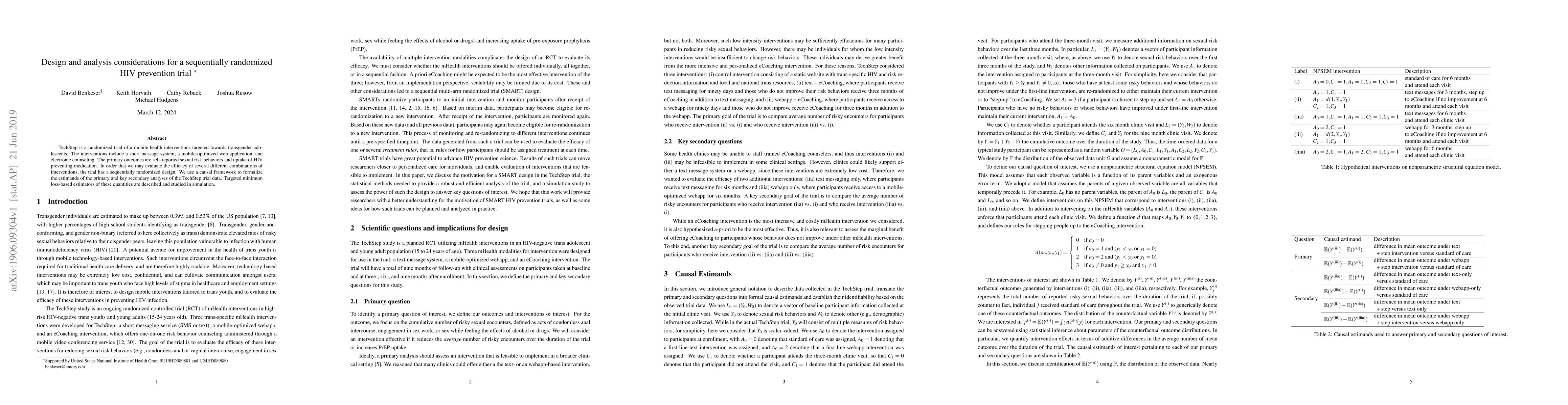 This paper discusses the design and analysis of the TechStep trial, which evaluates mobile health interventions for transgender adolescents to reduce HIV risk. The trial employs a sequentially randomized design to assess various intervention combinations, using causal frameworks and targeted minimum loss-based estimators for primary and secondary outcomes.