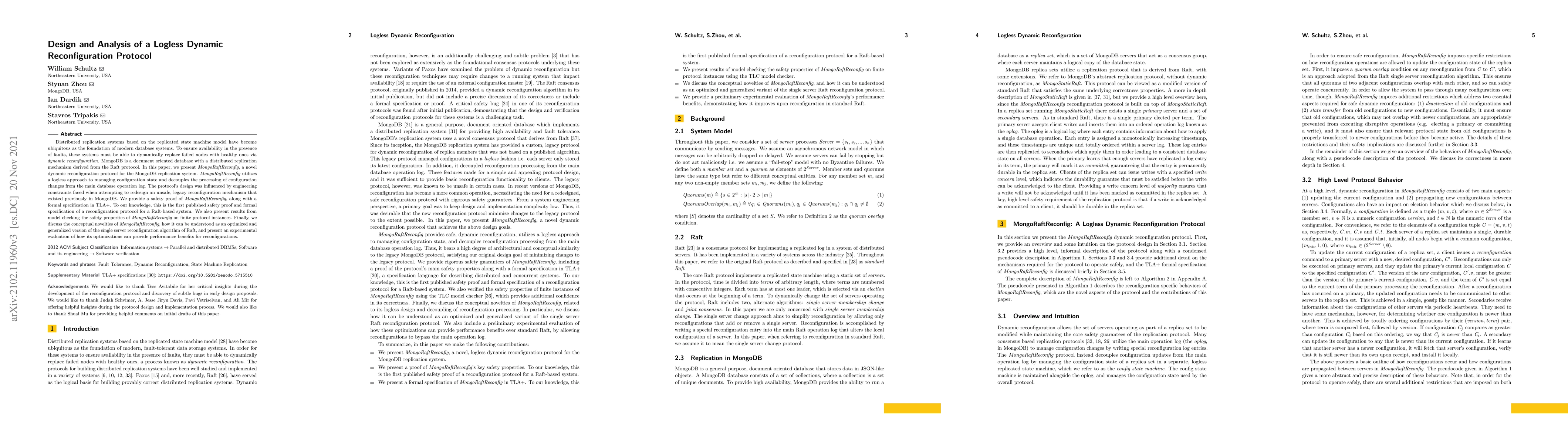 This paper introduces MongoRaftReconfig, a logless dynamic reconfiguration protocol for MongoDB's replication system, which decouples configuration changes from the main log and provides safety proofs and formal specifications. The protocol aims to improve performance over legacy mechanisms and includes an experimental evaluation of its optimizations.
