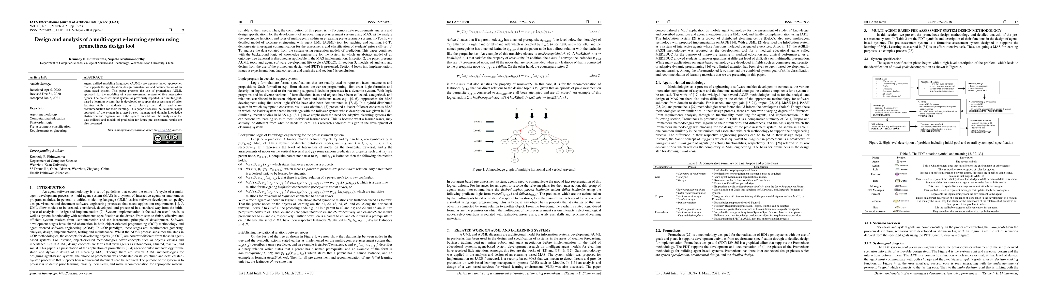 Agent unified modeling languages (AUML) are agent-oriented approaches that supports the specification, design, visualization and documentation of an agent-based system. This paper presents the use of Prometheus AUML approach for the modeling of a Pre-assessment System of five interactive agents. The Pre-assessment System, as previously reported, is a multi-agent based e-learning system that is developed to support the assessment of prior learning skills in students so as to classify their skills and make recommendation for their learning. This paper discusses the detailed design approach of the system in a step-by-step manner; and domain knowledge abstraction and organization in the system. In addition, the analysis of the data collated and models of prediction for future pre-assessment results are also presented.