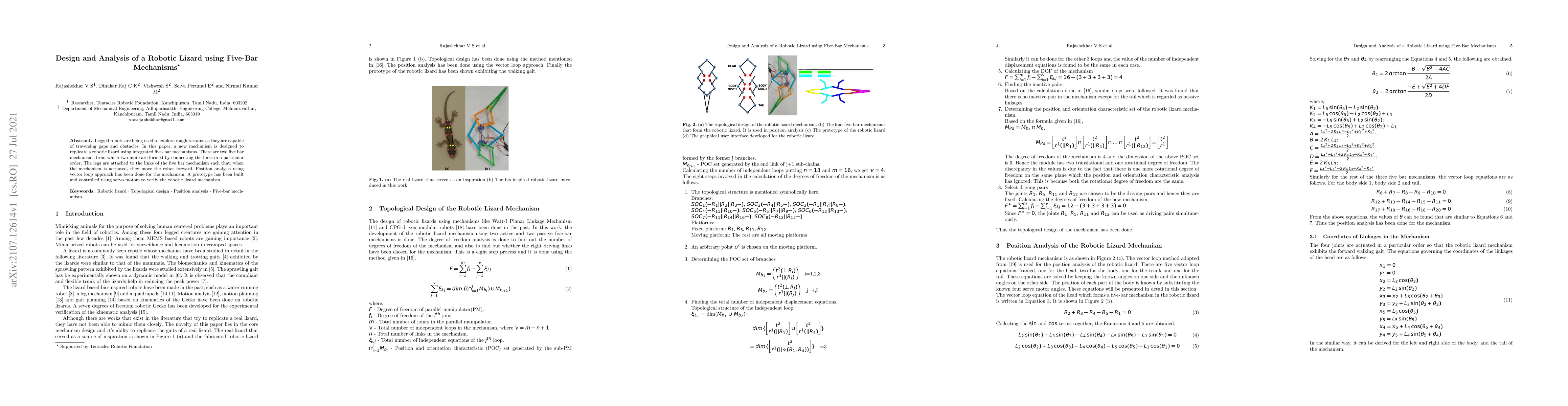 Legged robots are being used to explore rough terrains as they are capable of traversing gaps and obstacles. In this paper, a new mechanism is designed to replicate a robotic lizard using integrated five-bar mechanisms. There are two five bar mechanisms from which two more are formed by connecting the links in a particular order. The legs are attached to the links of the five bar mechanism such that, when the mechanism is actuated, they move the robot forward. Position analysis using vector loop approach has been done for the mechanism. A prototype has been built and controlled using servo motors to verify the robotic lizard mechanism.