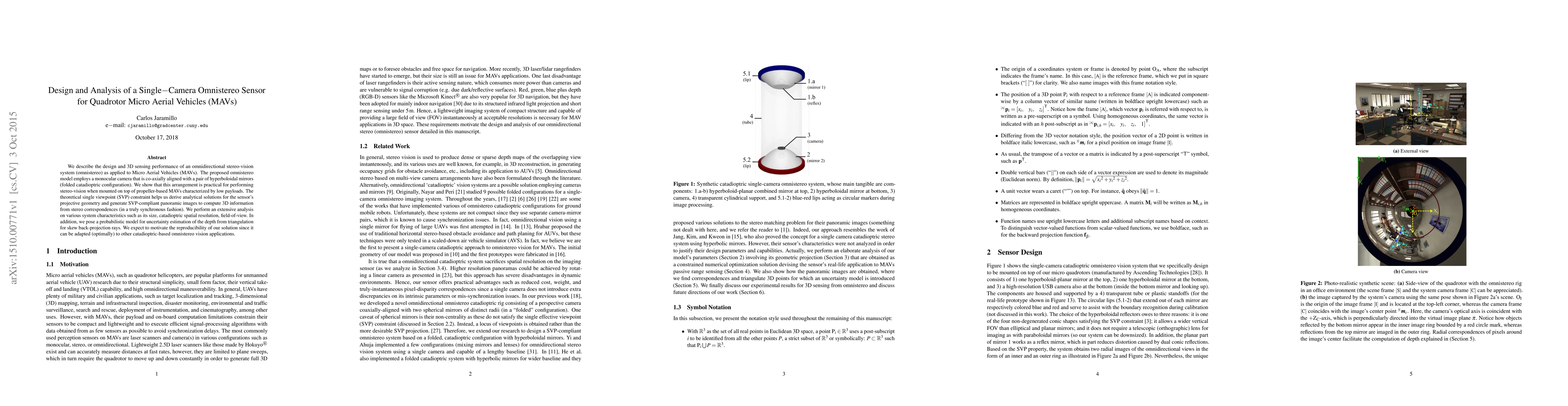 We describe the design and 3D sensing performance of an omnidirectional stereo-vision system (omnistereo) as applied to Micro Aerial Vehicles (MAVs). The proposed omnistereo model employs a monocular camera that is co-axially aligned with a pair of hyperboloidal mirrors (folded catadioptric configuration). We show that this arrangement is practical for performing stereo-vision when mounted on top of propeller-based MAVs characterized by low payloads. The theoretical single viewpoint (SVP) constraint helps us derive analytical solutions for the sensor's projective geometry and generate SVP-compliant panoramic images to compute 3D information from stereo correspondences (in a truly synchronous fashion). We perform an extensive analysis on various system characteristics such as its size, catadioptric spatial resolution, field-of-view. In addition, we pose a probabilistic model for uncertainty estimation of the depth from triangulation for skew back-projection rays. We expect to motivate the reproducibility of our solution since it can be adapted (optimally) to other catadioptric-based omnistereo vision applications.