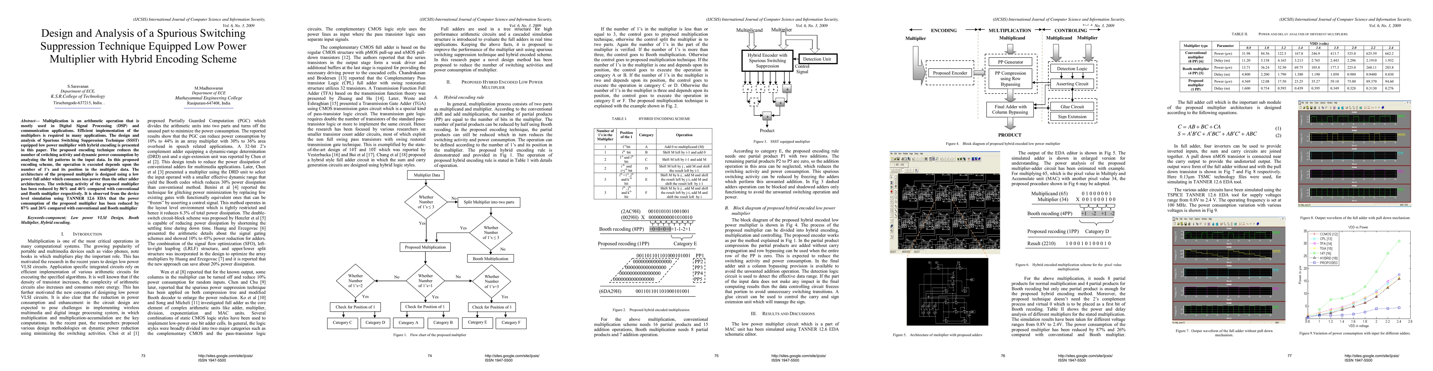 Multiplication is an arithmetic operation that is mostly used in Digital Signal Processing (DSP) and communication applications. Efficient implementation of the multipliers is required in many applications. The design and analysis of Spurious Switching Suppression Technique (SSST) equipped low power multiplier with hybrid encoding is presented in this paper. The proposed encoding technique reduces the number of switching activity and dynamic power consumption by analyzing the bit patterns in the input data. In this proposed encoding scheme, the operation is executed depends upon the number of 1s and its position in the multiplier data. The architecture of the proposed multiplier is designed using a low power full adder which consumes less power than the other adder architectures. The switching activity of the proposed multiplier has been reduced by 86 percent and 46percent compared with conventional and Booth multiplier respectively. It is observed from the device level simulation using TANNER 12.6 EDA that the power consumption of the proposed multiplier has been reduced by 87 percent and 26 percent compared with conventional and Booth multiplier.