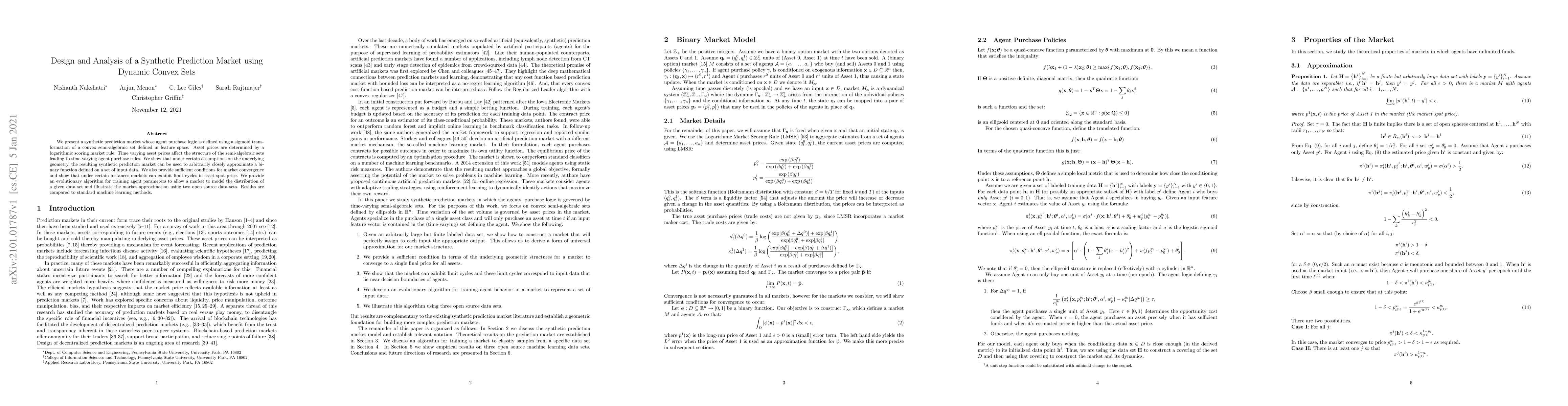 This paper introduces a synthetic prediction market using dynamic convex sets and sigmoid transformations to approximate binary functions on input data. It presents conditions for market convergence and potential limit cycles in asset prices. An evolutionary algorithm is proposed for training agent parameters to model data distribution, with results compared to standard machine learning methods using open-source datasets.