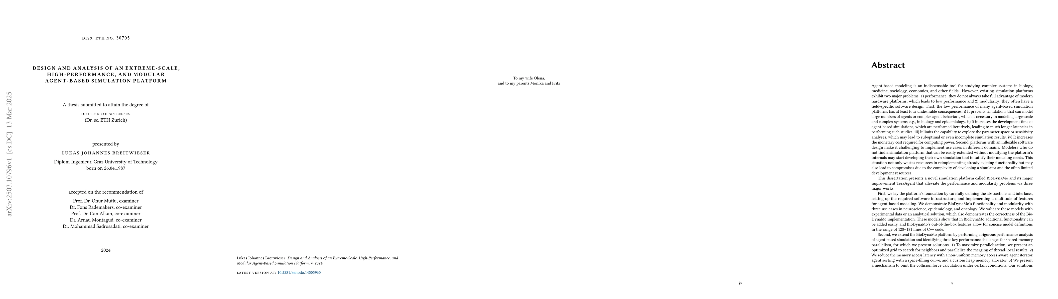 This paper presents BioDynaMo and its enhanced version, TeraAgent, addressing performance and modularity challenges in agent-based simulation platforms. The platform achieves significant speedups through optimized algorithms and distributed computing, enabling simulations of up to 500 billion agents across thousands of cores.