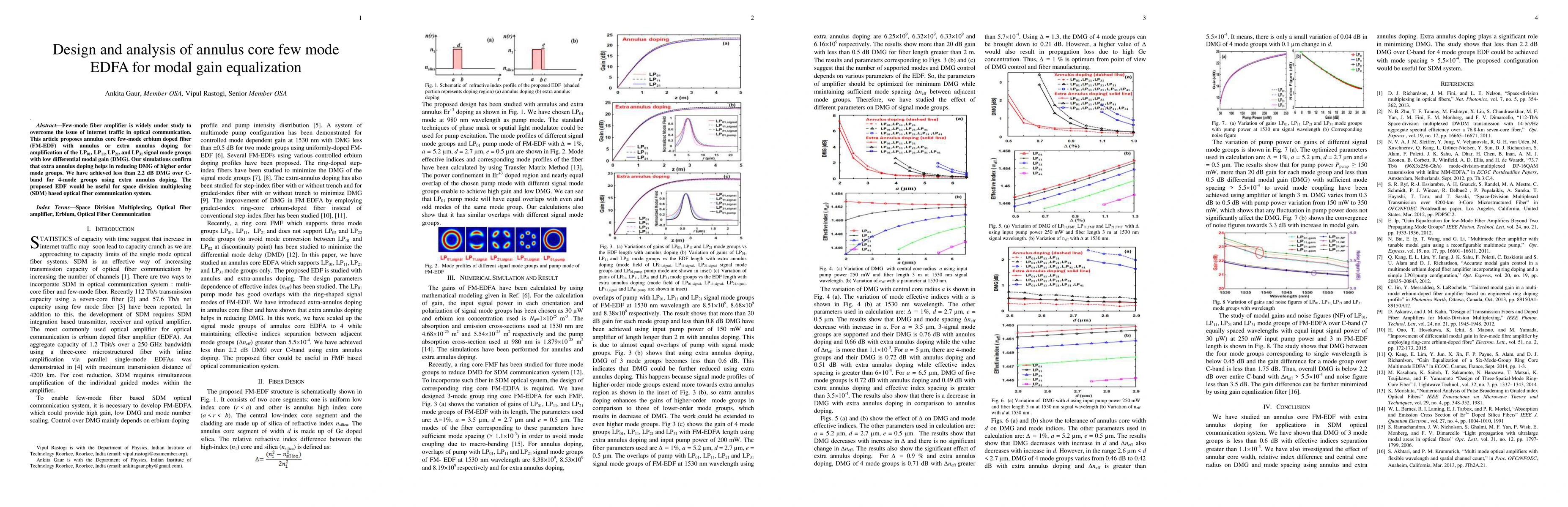 Few-mode fiber amplifier is widely under study to overcome the issue of internet traffic in optical communication. This article proposes annulus core few-mode erbium doped fiber (FM-EDF) with annulus or extra annulus doping for amplification of the LP01, LP11, LP21, and LP31 signal mode groups with low differential modal gain (DMG). Our simulations confirm that extra annulus doping helps in reducing DMG of higher order mode groups. We have achieved less than 2.2 dB DMG over C-band for 4-mode groups using extra annulus doping. The proposed EDF would be useful for space division multiplexing (SDM) based optical fiber communication system.