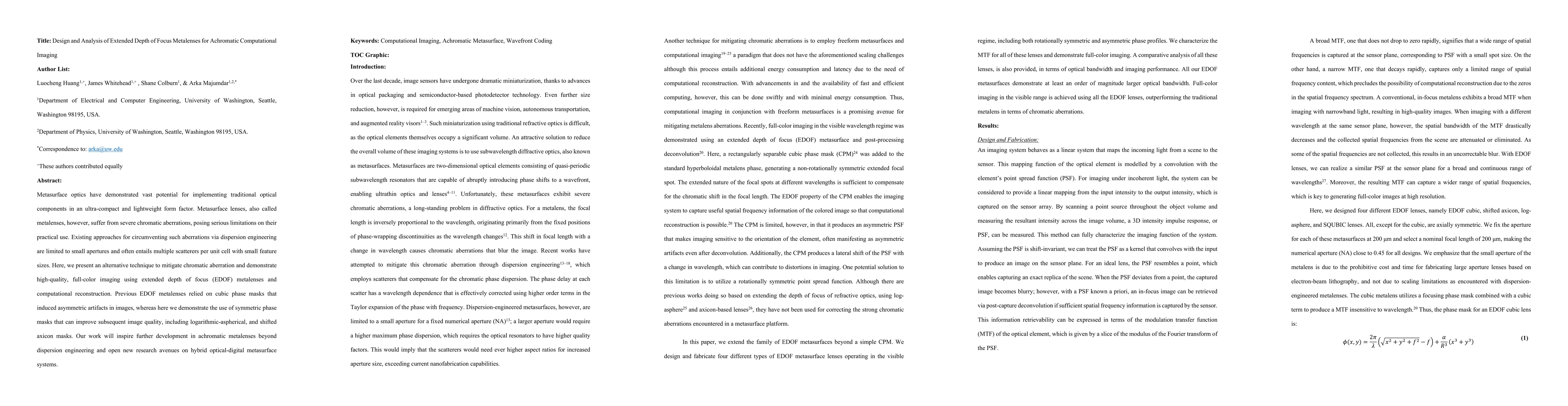 This paper presents a novel technique to mitigate chromatic aberration in metalenses using extended depth of focus (EDOF) and symmetric phase masks, achieving high-quality, full-color imaging without the asymmetric artifacts of previous methods. This advancement opens new research avenues for achromatic metalenses and hybrid optical-digital metasurface systems.