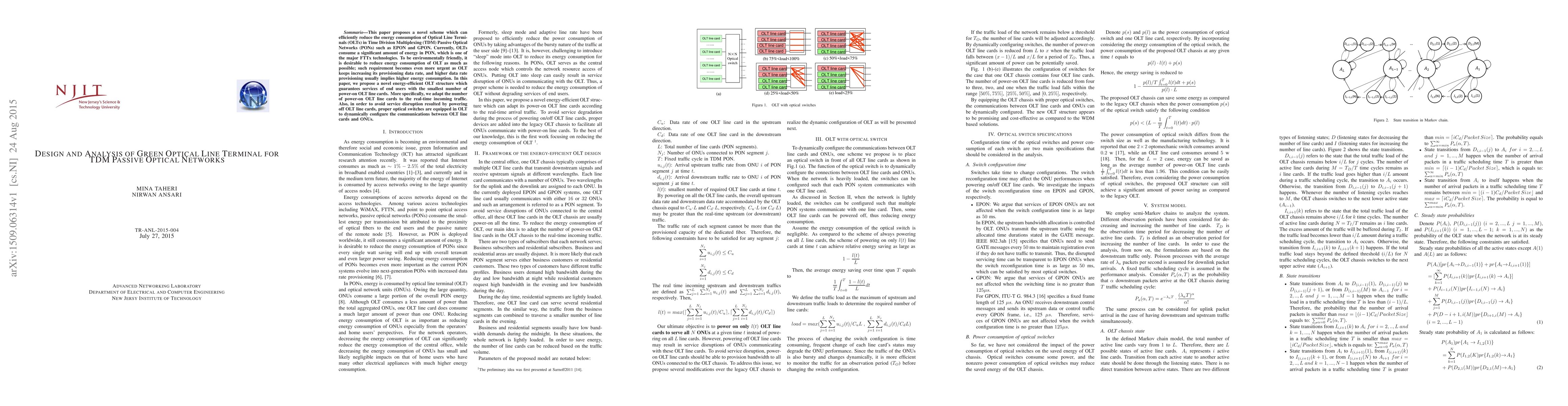 This paper proposes a novel scheme which can efficiently reduce the energy consumption of Optical Line Terminals (OLTs) in Time Division Multiplexing (TDM) Passive Optical Networks (PONs) such as EPON and GPON. Currently, OLTs consume a significant amount of energy in PON, which is one of the major FTTx technologies. To be environmentally friendly, it is desirable to reduce energy consumption of OLT as much as possible; such requirement becomes even more urgent as OLT keeps increasing its provisioning data rate, and higher data rate provisioning usually implies higher energy consumption. In this paper, we propose a novel energy-efficient OLT structure which guarantees services of end users with the smallest number of power-on OLT line cards. More specifically, we adapt the number of power-on OLT line cards to the real-time incoming traffic. Also, in order to avoid service disruption resulted by powering off OLT line cards, proper optical switches are equipped in OLT to dynamically configure the communications between OLT line cards and ONUs.