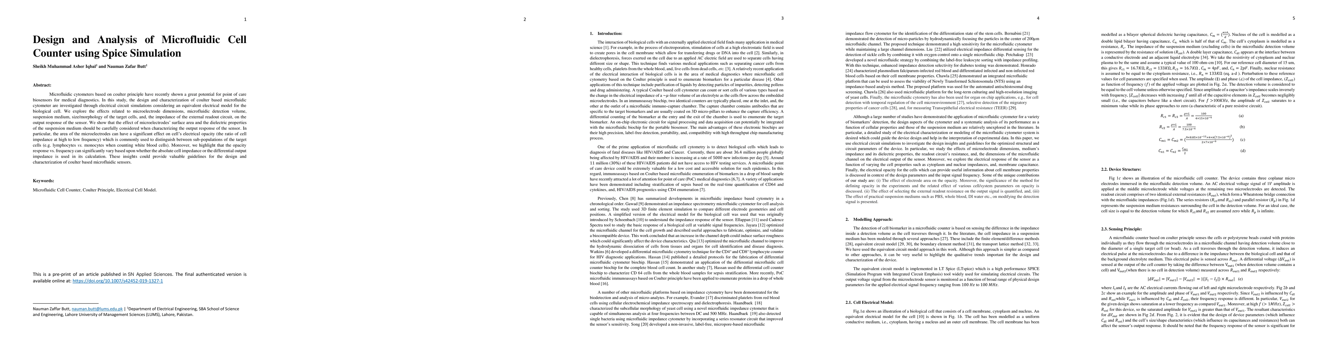 Microfluidic cytometers based on coulter principle have recently shown a great potential for point of care biosensors for medical diagnostics. In this study, the design of coulter based microfluidic cytometer is investigated by using electrical circuit simulations. We explore the effects of physical dimensions of the microelectrodes, the measurement volume, size/morphology of the targeted cells, electrical properties of the reagents in the measurement volume, and, the impedance of external readout circuit, on the sensitivity of the sensor. We show that the effect of microelectrode's surface area and the dielectric properties of the suspension medium should be carefully considered when characterizing the output response of the sensor. In particular, the area of microelectrodes can have significant effect on cells electrical opacity( the ratio of the cell impedance at high to low frequency) which is commonly used to distinguish between sub-population of the target cells( e.g. lymphocytes vs monocytes when counting white blood cells).Moreover, we highlight that the opacity response vs frequency can significantly vary depending upon whether the absolute cell impedance or the differential output impedance is used in the calculation. These insights can provide valuable guidelines for the design and characterization of coulter based microfluidic sensors.