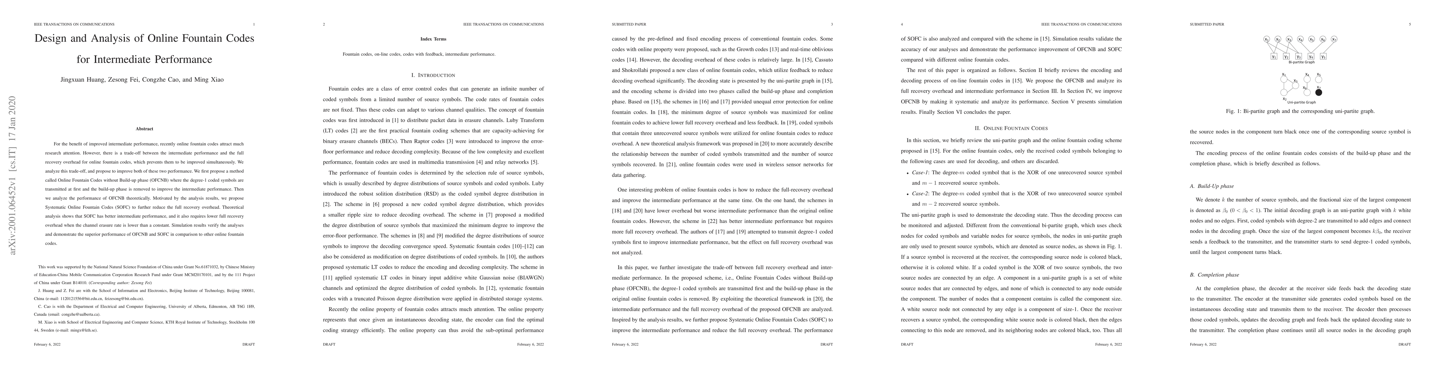 This paper proposes two novel online fountain codes, OFCNB and SOFC, to enhance intermediate performance and reduce full recovery overhead. OFCNB eliminates the build-up phase to improve intermediate performance, while SOFC further reduces recovery overhead, achieving better performance under low channel erasure rates.