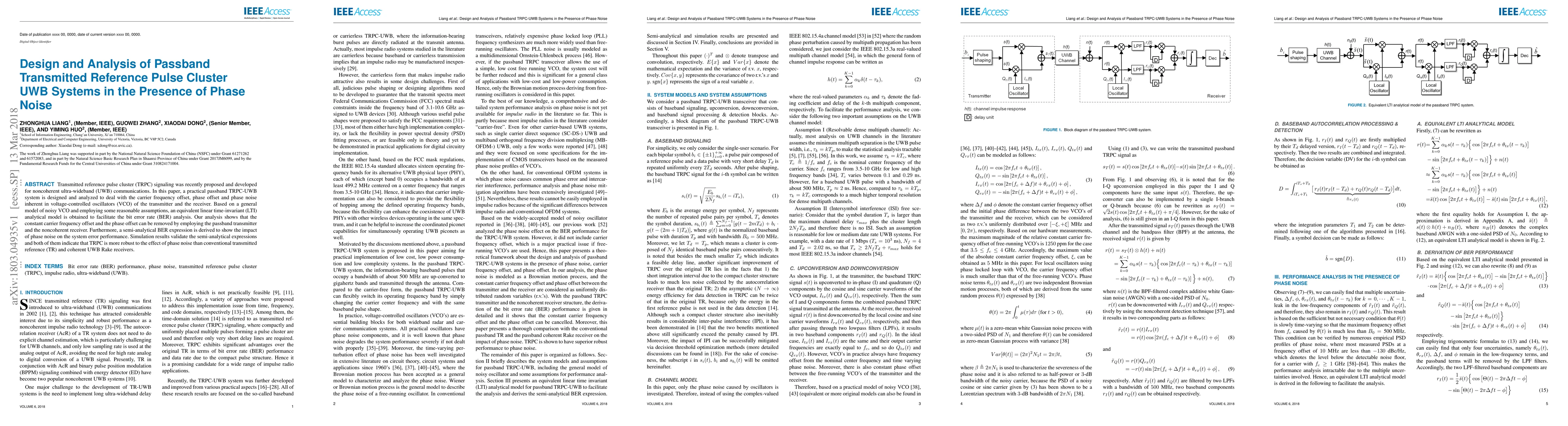 This paper designs and analyzes a passband transmitted reference pulse cluster (TRPC) ultra-wideband (UWB) system to address carrier frequency offset, phase offset, and phase noise in voltage-controlled oscillators. The analysis reveals that TRPC is more robust to phase noise than conventional UWB systems, as validated by simulation results.