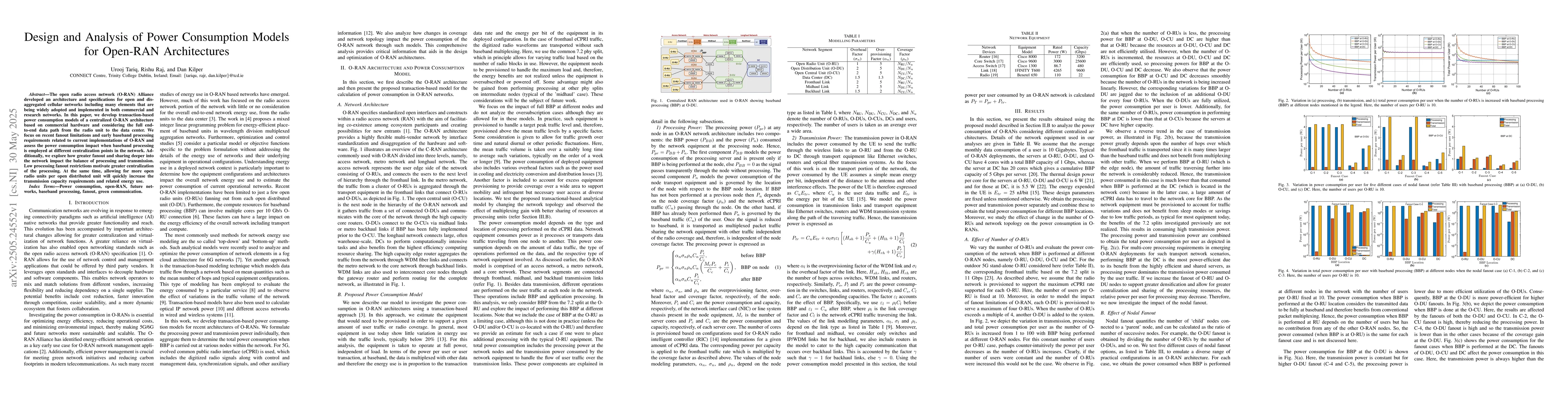 This paper presents transaction-based power consumption models for centralized Open-RAN architectures using commercial hardware. It highlights the impact of varying baseband processing centralization points on power use, showing that lower processing fanout necessitates greater centralization, while increased open radio units per open distributed unit raises transmission capacity and energy consumption.