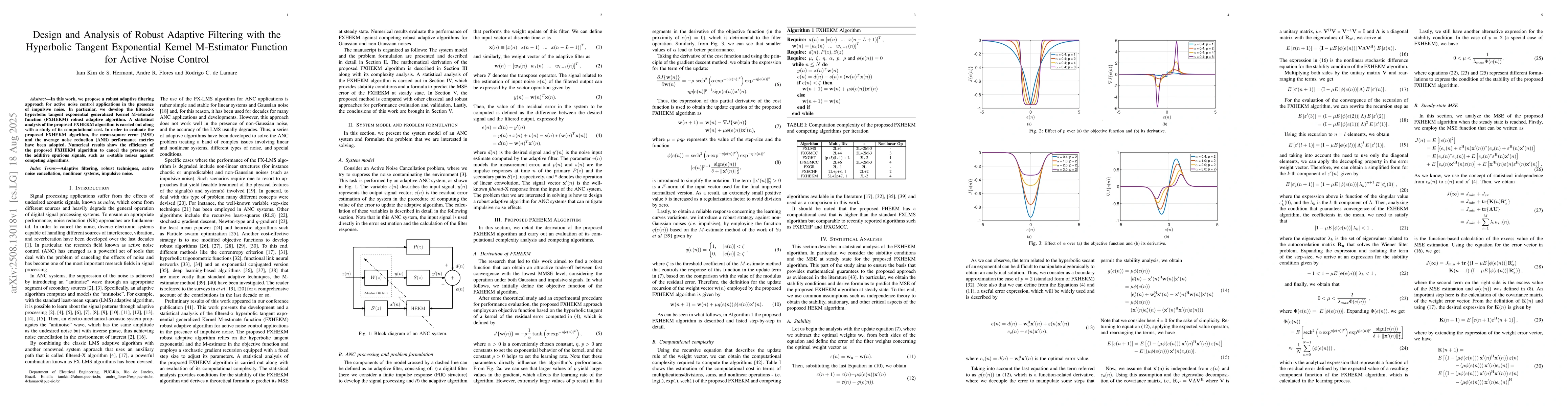 In this work, we propose a robust adaptive filtering approach for active noise control applications in the presence of impulsive noise. In particular, we develop the filtered-x hyperbolic tangent exponential generalized Kernel M-estimate function (FXHEKM) robust adaptive algorithm. A statistical analysis of the proposed FXHEKM algorithm is carried out along with a study of its computational cost. {In order to evaluate the proposed FXHEKM algorithm, the mean-square error (MSE) and the average noise reduction (ANR) performance metrics have been adopted.} Numerical results show the efficiency of the proposed FXHEKM algorithm to cancel the presence of the additive spurious signals, such as \textbf{$\alpha$}-stable noises against competing algorithms.