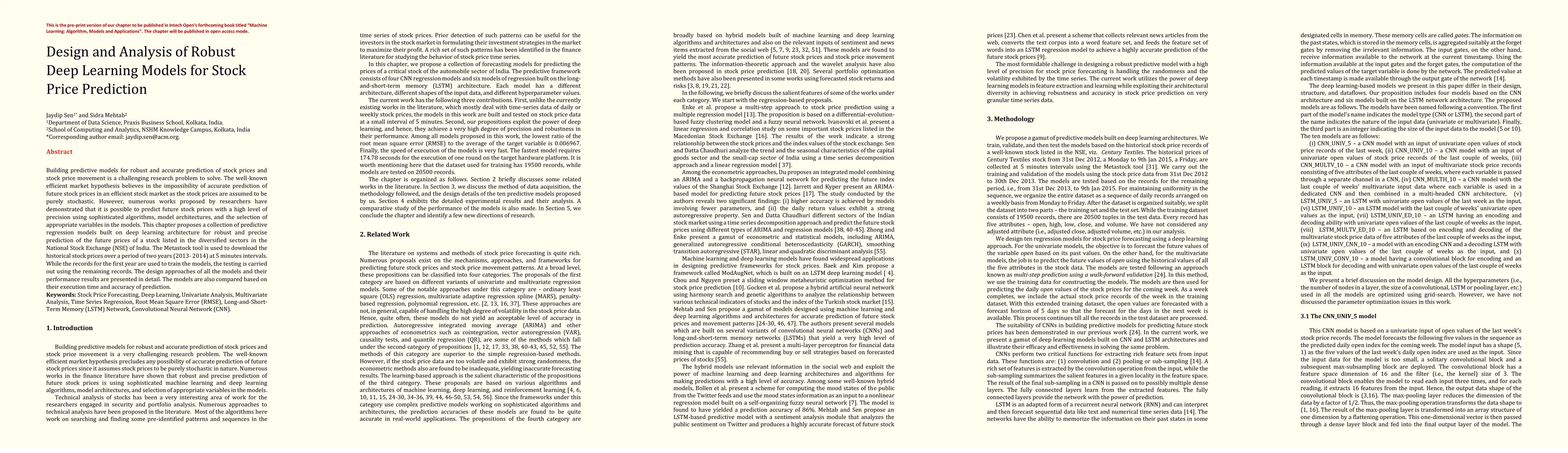 Building predictive models for robust and accurate prediction of stock prices and stock price movement is a challenging research problem to solve. The well-known efficient market hypothesis believes in the impossibility of accurate prediction of future stock prices in an efficient stock market as the stock prices are assumed to be purely stochastic. However, numerous works proposed by researchers have demonstrated that it is possible to predict future stock prices with a high level of precision using sophisticated algorithms, model architectures, and the selection of appropriate variables in the models. This chapter proposes a collection of predictive regression models built on deep learning architecture for robust and precise prediction of the future prices of a stock listed in the diversified sectors in the National Stock Exchange (NSE) of India. The Metastock tool is used to download the historical stock prices over a period of two years (2013- 2014) at 5 minutes intervals. While the records for the first year are used to train the models, the testing is carried out using the remaining records. The design approaches of all the models and their performance results are presented in detail. The models are also compared based on their execution time and accuracy of prediction.