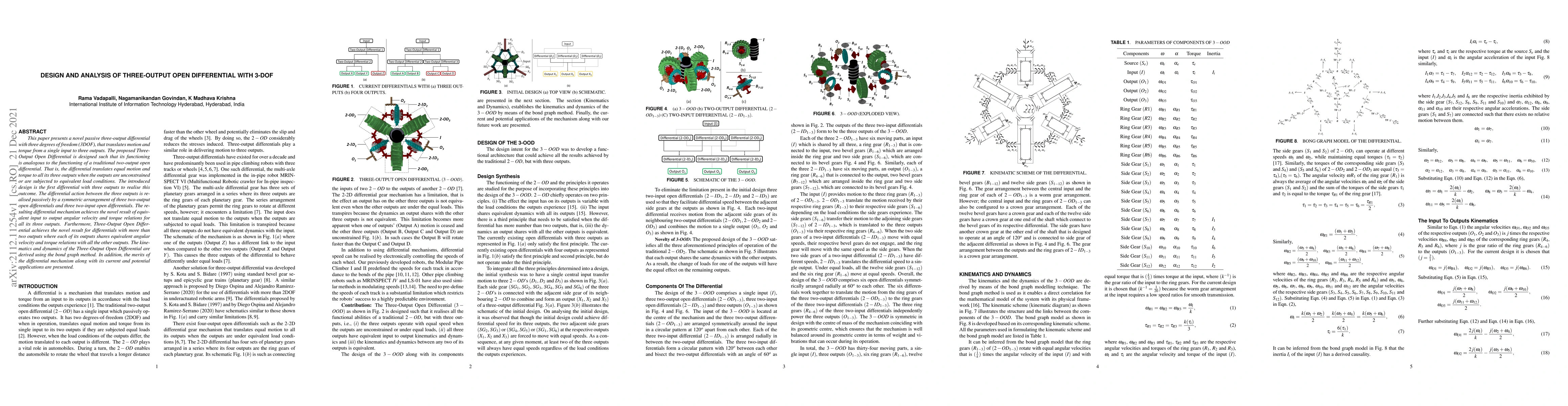 The main technical contribution is the development of a three-output differential gear mechanism with improved functionality, kinematics, and dynamics.