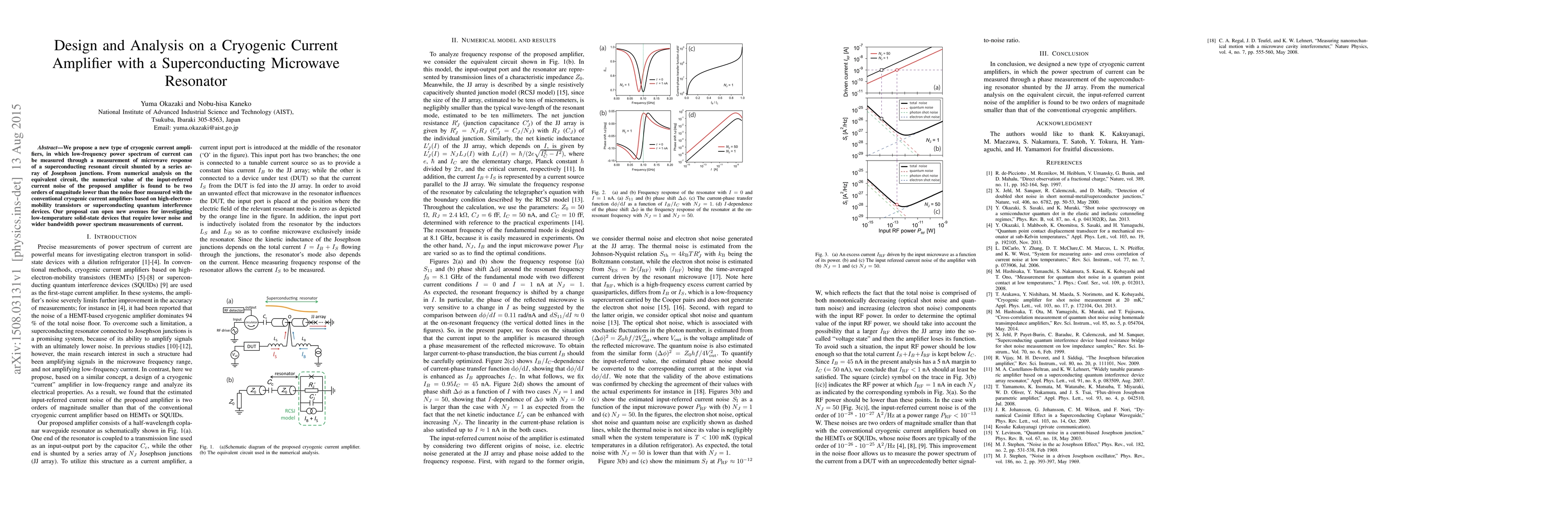 This paper proposes a cryogenic current amplifier utilizing a superconducting microwave resonator and Josephson junctions, achieving two orders of magnitude lower input-referred current noise than conventional amplifiers. This advancement could significantly enhance measurements in low-temperature solid-state devices.