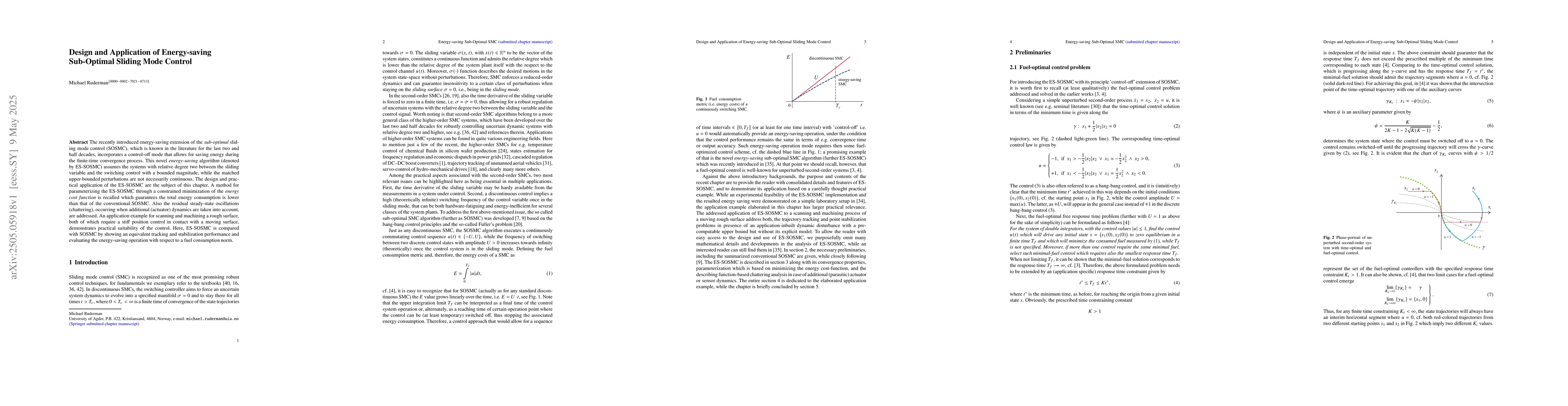 The paper presents an energy-saving sub-optimal sliding mode control (ES-SOSMC) with a constrained minimization approach for parameterization, ensuring lower energy consumption and reduced chattering compared to conventional SOSMC.