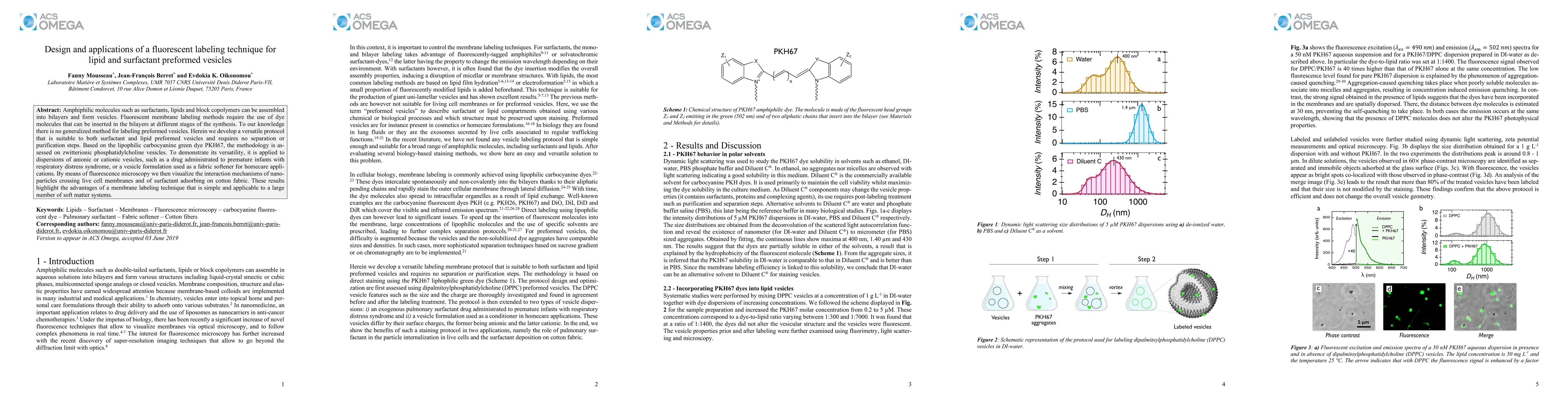 This paper presents a novel fluorescent labeling technique using PKH67 dye for labeling preformed lipid and surfactant vesicles without requiring separation or purification. The method is demonstrated on various vesicle types and applied to visualize interactions in biological and material science contexts.