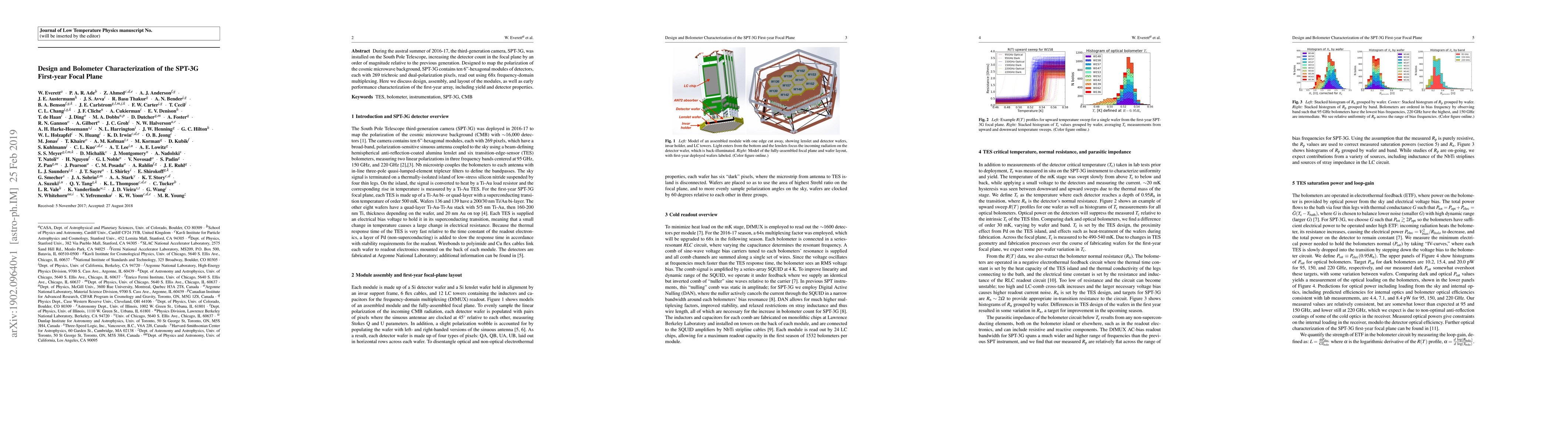 This paper details the design and initial characterization of the SPT-3G focal plane, installed on the South Pole Telescope in 2016-17. The SPT-3G features ten hexagonal modules with 2,690 dual-polarization pixels, significantly increasing detector count and employing frequency-domain multiplexing for readout. The study discusses module design, assembly, and early performance metrics.