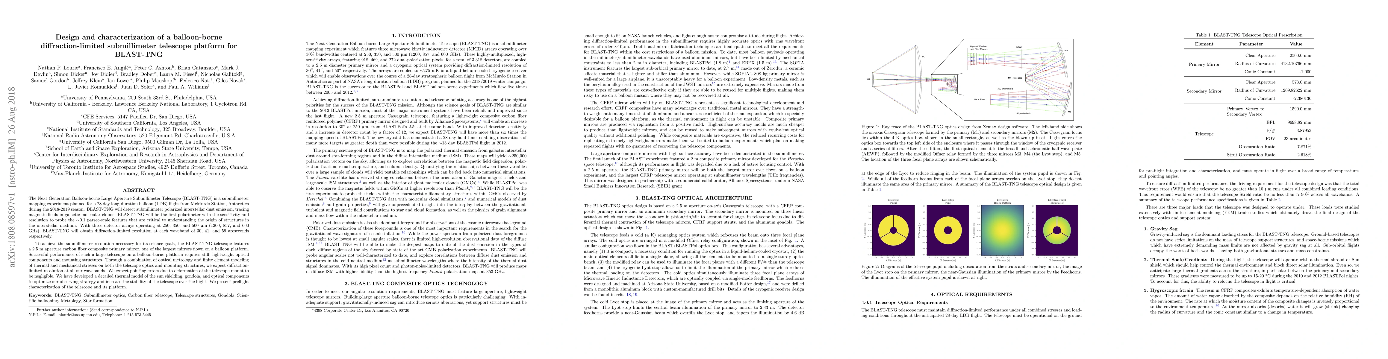 The BLAST-TNG telescope, designed for a 28-day balloon flight, features a 2.5 m aperture carbon fiber mirror to achieve diffraction-limited resolution in submillimeter wavelengths, enabling detailed mapping of interstellar dust and magnetic fields. Preflight characterization ensures optimal performance and stability during the flight.