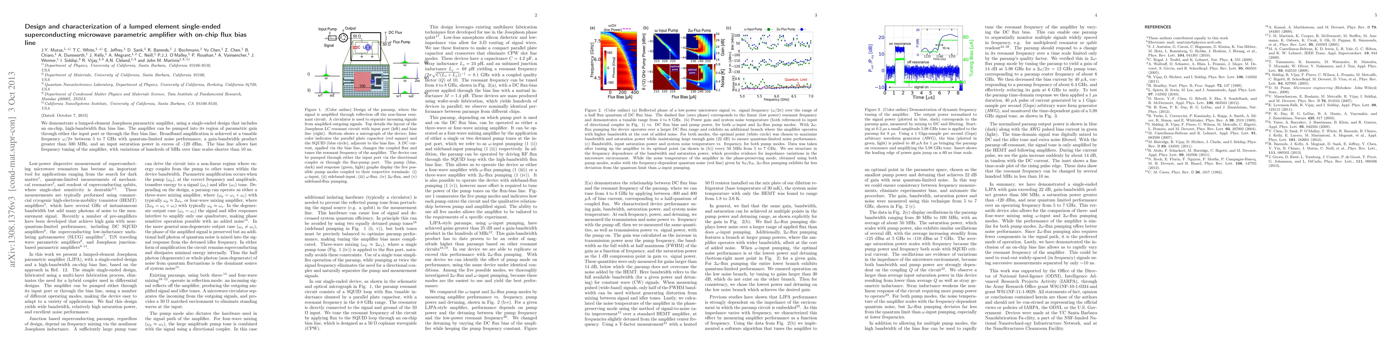 This paper presents a lumped-element superconducting microwave parametric amplifier with a single-ended design featuring an on-chip flux bias line, achieving broadband amplification between 5 to 7 GHz with quantum-limited noise performance. The bias line enables rapid frequency tuning over hundreds of MHz in less than 10 ns.