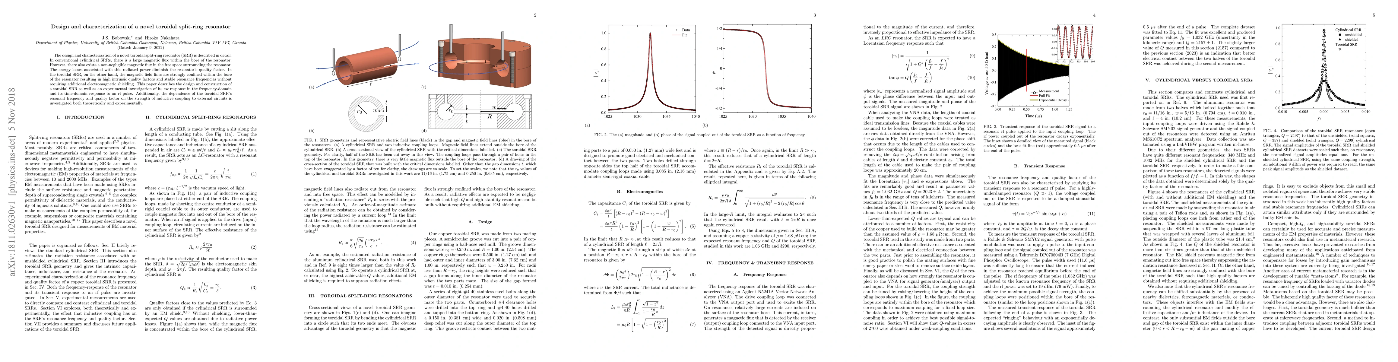 The design and characterization of a novel toroidal split-ring resonator (SRR) is described in detail. In conventional cylindrical SRRs, there is a large magnetic flux within the bore of the resonator. However, there also exists a non-negligible magnetic flux in the free space surrounding the resonator. The energy losses associated with this radiated power diminish the resonator's quality factor. In the toroidal SRR, on the other hand, the magnetic field lines are strongly confined within the bore of the resonator resulting in high intrinsic quality factors and stable resonance frequencies without requiring additional electromagnetic shielding. This paper describes the design and construction of a toroidal SRR as well as an experimental investigation of its cw response in the frequency-domain and its time-domain response to an rf pulse. Additionally, the dependence of the toroidal SRR's resonant frequency and quality factor on the strength of inductive coupling to external circuits is investigated both theoretically and experimentally.