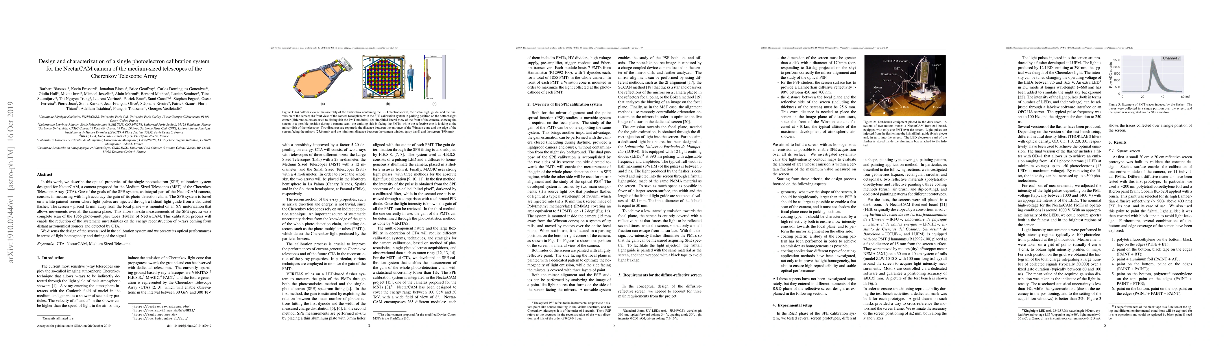 In this work, we describe the optical properties of the single photoelectron (SPE) calibration system designed for NectarCAM, a camera proposed for the Medium Sized Telescopes (MST) of the Cherenkov Telescope Array (CTA). One of the goals of the SPE system, as integral part of the NectarCAM camera, consists in measuring with high accuracy the gain of its photo-detection chain. The SPE system is based on a white painted screen where light pulses are injected through a fishtail light guide from a dedicated flasher. The screen - placed 15 mm away from the focal plane - is mounted on an XY motorization that allows movements over all the camera plane. This allows in-situ measurements of the SPE spectra via a complete scan of the 1855 photo-multiplier tubes (PMTs) of NectarCAM. This calibration process will enable the reduction of the systematic uncertainties on the energy reconstruction of $\gamma$-rays coming from distant astronomical sources and detected by CTA.