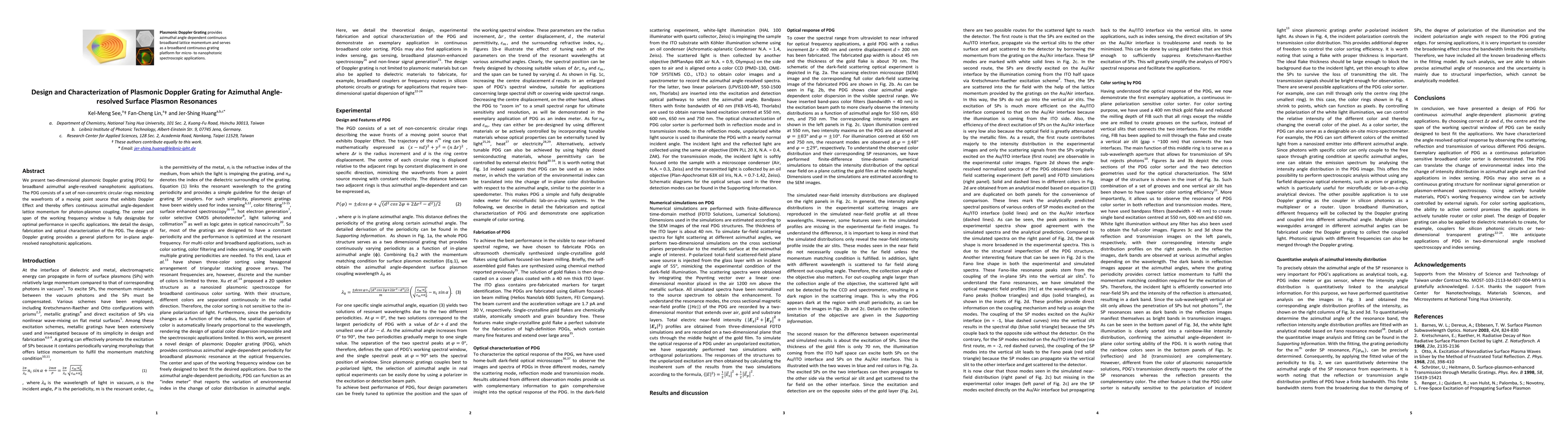 We present two-dimensional plasmonic Doppler grating (PDG) for broadband azimuthal angle-resolved nanophotonic applications. The PDG consists of a set of non-concentric circular rings mimicking the wavefronts of a moving point source that exhibits Doppler Effect and thereby offers continuous azimuthal angle-dependent lattice momentum for photon-plasmon coupling. The center and span of the working frequency window are fully designable for optimal performance in specific applications. We detail the design, fabrication and optical characterization of the PDG. The design of Doppler grating provides a general platform for in-plane angle-resolved nanophotonic applications.