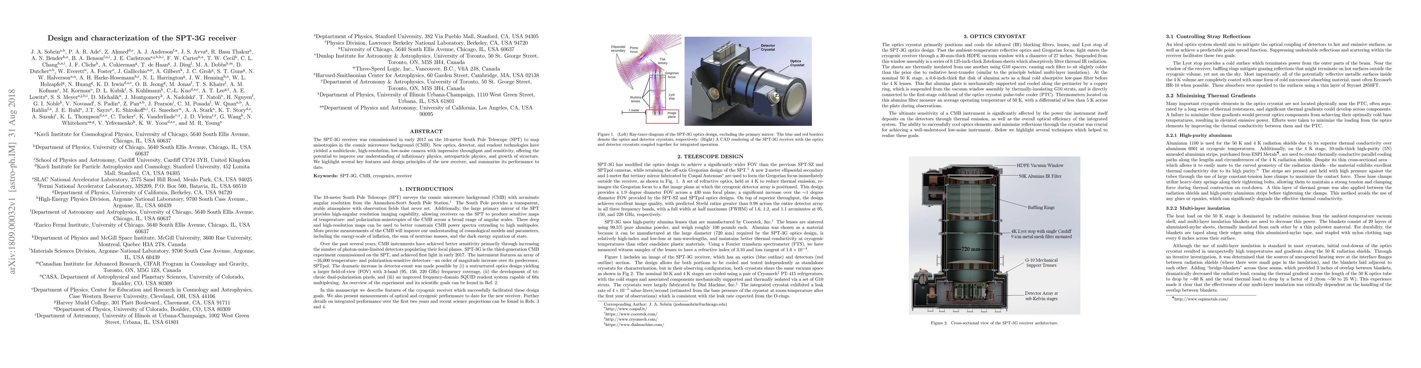 The SPT-3G receiver, deployed in 2017 on the South Pole Telescope, utilizes advanced optics and detector technologies to create a high-resolution, multichroic camera with low noise, enhancing studies of cosmic microwave background anisotropies and improving insights into inflationary physics and structure growth. Its performance showcases significant improvements in throughput and sensitivity.