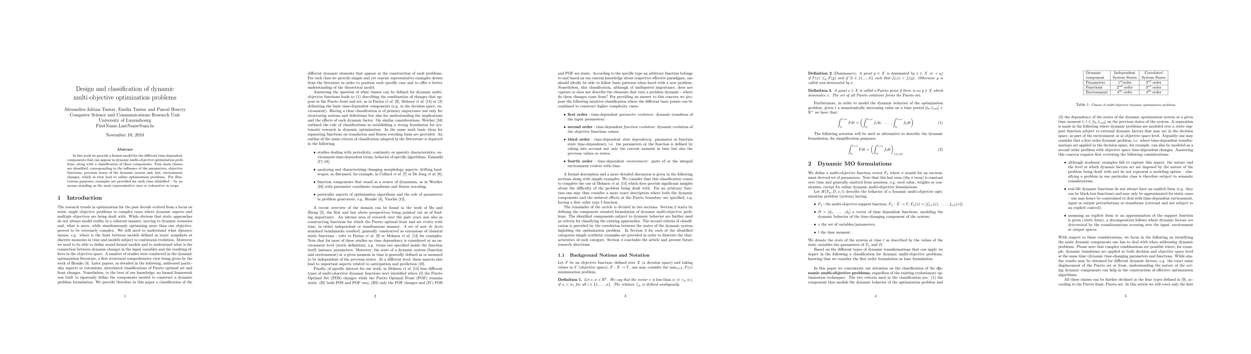 In this work we provide a formal model for the different time-dependent components that can appear in dynamic multi-objective optimization problems, along with a classification of these components. Four main classes are identified, corresponding to the influence of the parameters, objective functions, previous states of the dynamic system and, last, environment changes, which in turn lead to online optimization problems. For illustration purposes, examples are provided for each class identified - by no means standing as the most representative ones or exhaustive in scope.