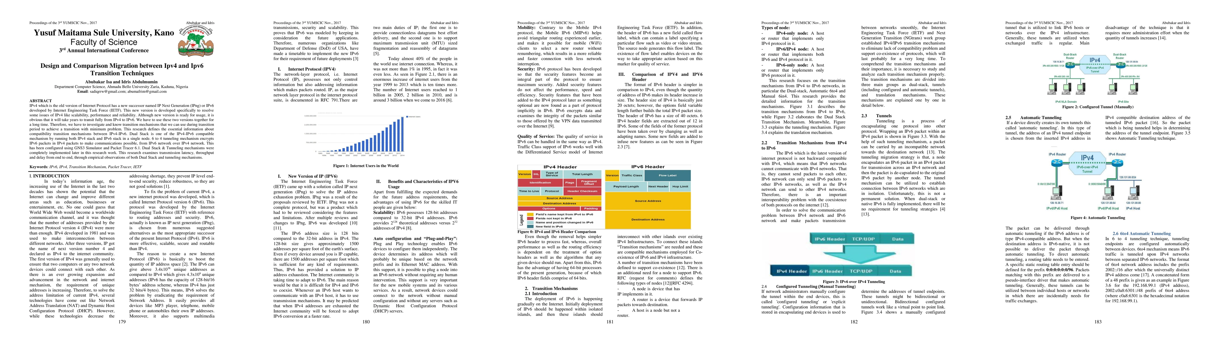 This research investigates transition mechanisms between IPv4 and IPv6, focusing on Dual Stack and 6to4 tunneling methods. It examines transmission latency, throughput, and delay using GNS3 Simulator and Packet Tracer 6.1 to compare the performance of these mechanisms during the coexistence period of both protocols.