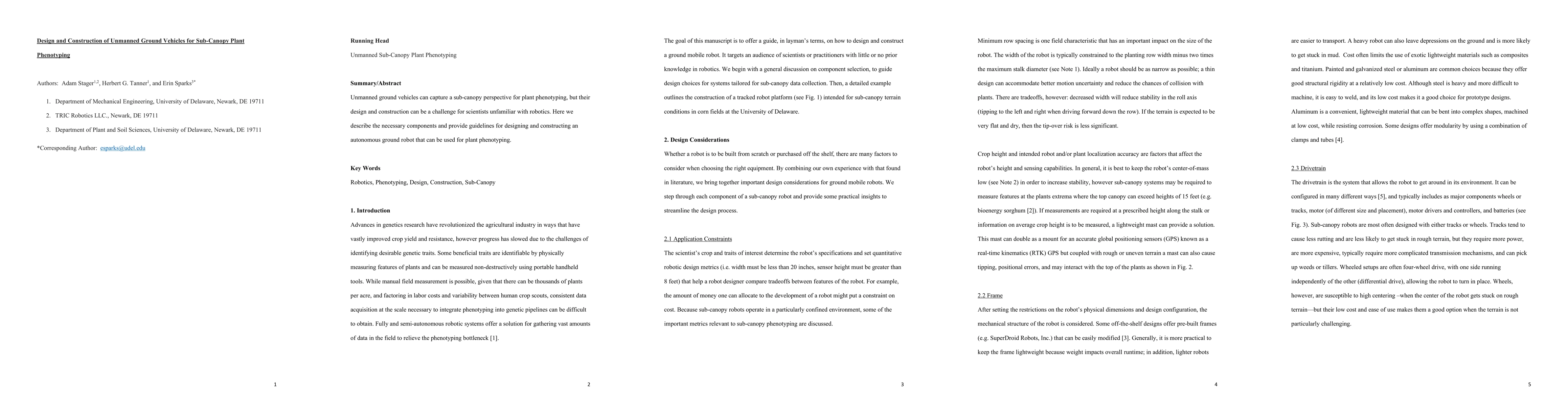 Unmanned ground vehicles can capture a sub-canopy perspective for plant phenotyping, but their design and construction can be a challenge for scientists unfamiliar with robotics. Here we describe the necessary components and provide guidelines for designing and constructing an autonomous ground robot that can be used for plant phenotyping.