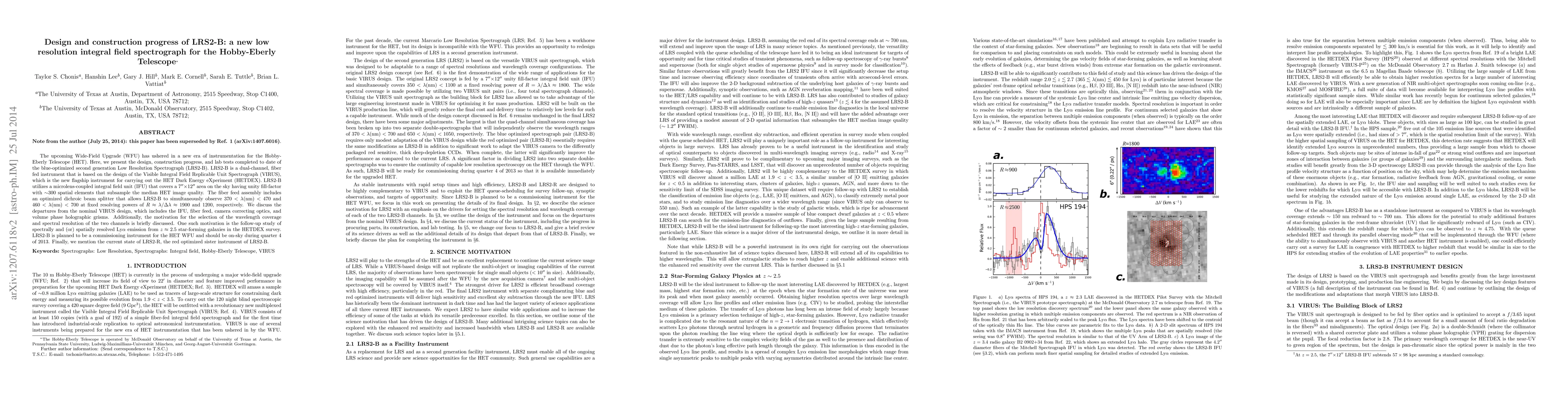 The upcoming Wide-Field Upgrade (WFU) has ushered in a new era of instrumentation for the Hobby-Eberly Telescope (HET). Here, we present the design, construction progress, and lab tests completed to date of the blue-optimized second generation Low Resolution Spectrograph (LRS2-B). LRS2-B is a dual-channel, fiber fed instrument that is based on the design of the Visible Integral Field Replicable Unit Spectrograph (VIRUS), which is the new flagship instrument for carrying out the HET Dark Energy eXperiment (HETDEX). LRS2-B utilizes a microlens-coupled integral field unit (IFU) that covers a 7"x12" area on the sky having unity fill-factor with ~300 spatial elements that subsample the median HET image quality. The fiber feed assembly includes an optimized dichroic beam splitter that allows LRS2-B to simultaneously observe 370 nm to 470 nm and 460 nm to 700 nm at fixed resolving powers of R \approx 1900 and 1200, respectively. We discuss the departures from the nominal VIRUS design, which includes the IFU, fiber feed, camera correcting optics, and volume phase holographic grisms. Additionally, the motivation for the selection of the wavelength coverage and spectral resolution of the two channels is briefly discussed. One such motivation is the follow-up study of spectrally and (or) spatially resolved Lyman-alpha emission from z ~ 2.5 star-forming galaxies in the HETDEX survey. LRS2-B is planned to be a commissioning instrument for the HET WFU and should be on-sky during quarter 4 of 2013. Finally, we mention the current state of LRS2-R, the red optimized sister instrument of LRS2-B.