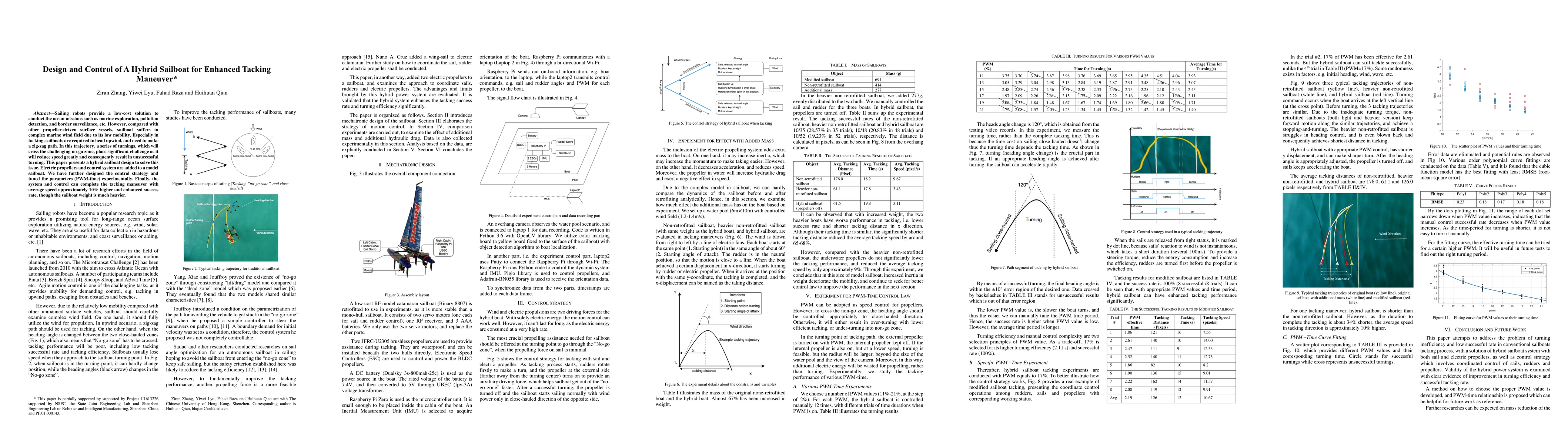 Sailing robots provide a low-cost solution to conduct the ocean missions such as marine exploration, pollution detection, and border surveillance, etc. However, compared with other propeller-driven surface vessels, sailboat suffers in complex marine wind field due to its low mobility. Especially in tacking, sailboats are required to head upwind, and need to make a zig-zag path. In this trajectory, a series of turnings, which will cross the challenging no-go zone, place significant challenge as it will reduce speed greatly and consequently result in unsuccessful turning. This paper presents a hybrid sailboat design to solve this issue. Electric propellers and control system are added to a model sailboat. We have further designed the control strategy and tuned the parameters (PWM-time) experimentally. Finally, the system and control can complete the tacking maneuver with average speed approximately 10% higher and enhanced success rate, though the sailboat weight is much heavier.