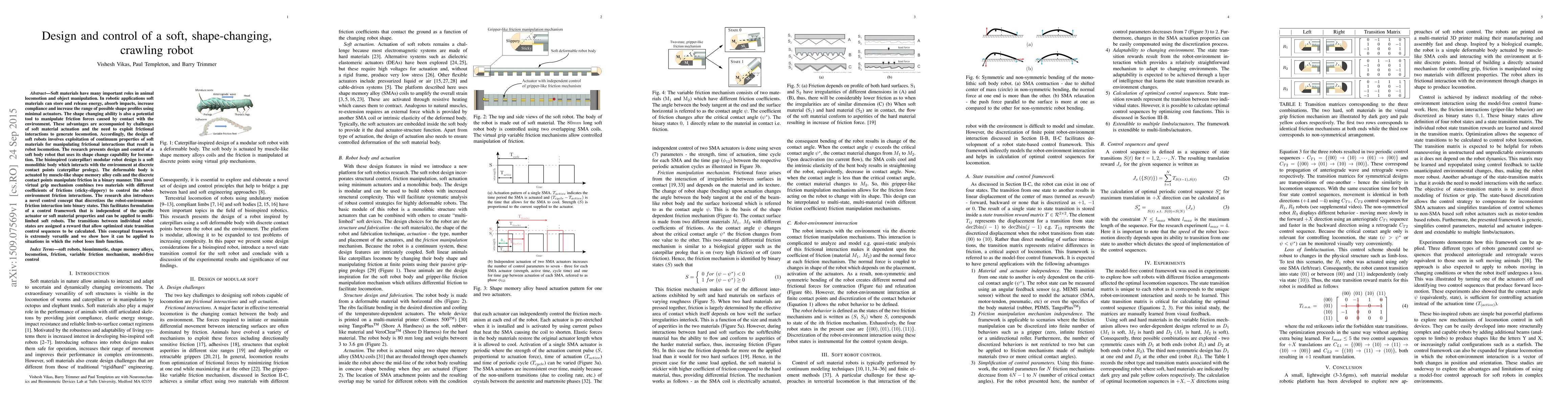 Soft materials have many important roles in animal locomotion and object manipulation. In robotic applications soft materials can store and release energy, absorb impacts, increase compliance and increase the range of possible shape profiles using minimal actuators. The shape changing ability is also a potential tool to manipulate friction forces caused by contact with the environment. These advantages are accompanied by challenges of soft material actuation and the need to exploit frictional interactions to generate locomotion. Accordingly, the design of soft robots involves exploitation of continuum properties of soft materials for manipulating frictional interactions that result in robot locomotion. The research presents design and control of a soft body robot that uses its shape change capability for locomotion. The bioinspired (caterpillar) modular robot design is a soft monolithic body which interacts with the environment at discrete contact points (caterpillar prolegs). The deformable body is actuated by muscle-like shape memory alloy coils and the discrete contact points manipulate friction in a binary manner. This novel virtual grip mechanism combines two materials with different coefficients of frictions (sticky-slippery) to control the robot-environment friction interactions. The research also introduces a novel control concept that discretizes the robot-environment-friction interaction into binary states. This facilitates formulation of a control framework that is independent of the specific actuator or soft material properties and can be applied to multi-limbed soft robots. The transitions between individual robot states are assigned a reward that allow optimized state transition control sequences to be calculated. This conceptual framework is extremely versatile and we show how it can be applied to situations in which the robot loses limb function.