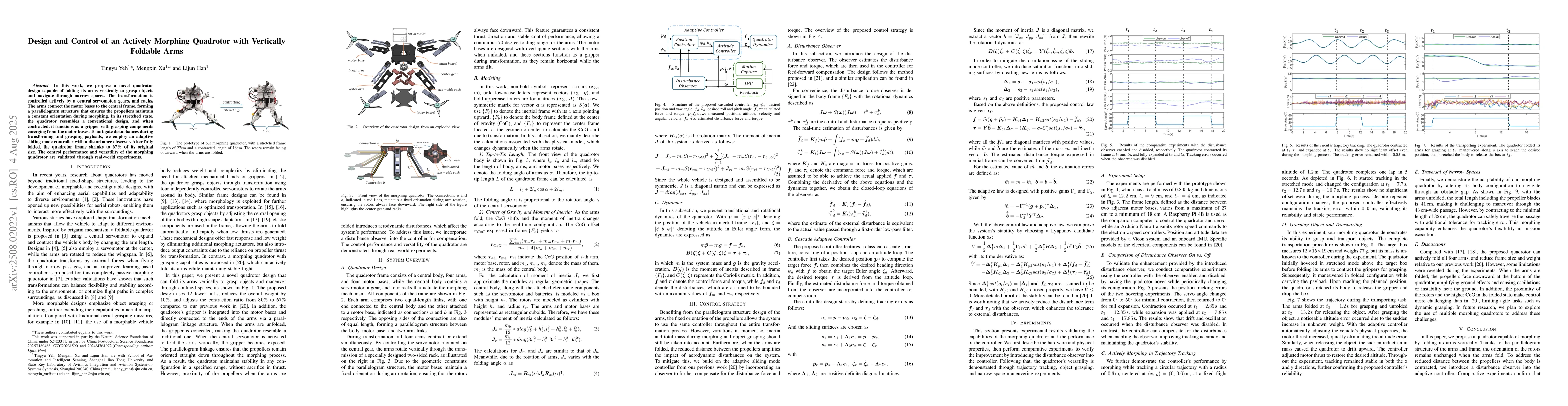 In this work, we propose a novel quadrotor design capable of folding its arms vertically to grasp objects and navigate through narrow spaces. The transformation is controlled actively by a central servomotor, gears, and racks. The arms connect the motor bases to the central frame, forming a parallelogram structure that ensures the propellers maintain a constant orientation during morphing. In its stretched state, the quadrotor resembles a conventional design, and when contracted, it functions as a gripper with grasping components emerging from the motor bases. To mitigate disturbances during transforming and grasping payloads, we employ an adaptive sliding mode controller with a disturbance observer. After fully folded, the quadrotor frame shrinks to 67% of its original size. The control performance and versatility of the morphing quadrotor are validated through real-world experiments.